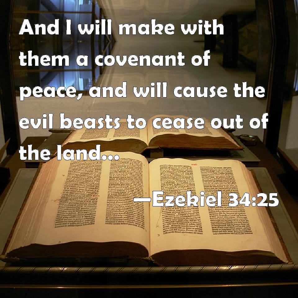 Choose a Background Ezekiel 34:25 And I will make with them a covenant of peace, and will cause the evil beasts to cease out of the land: and they shall dwell safely in the wilderness, and sleep in the woods. KJV: And I will make with them a covenant of peace, and will cause the evil beasts to cease out of the land: and they shall dwell safely in the wilderness, and sleep in the woods. DRB: And I will make a covenant of peace with them, and will cause the evil beasts to cease out of the land: and they that dwell in the wilderness shall sleep secure in the forests. DBT: And I will make with them a covenant of peace, and will cause evil beasts to cease out of the land; and they shall dwell in safety in the wilderness, and sleep in the woods. ERV: And I will make with them a covenant of peace, and will cause evil beasts to cease out of the land: and they shall dwell securely in the wilderness, and sleep in the woods. WBT: And I will make with them a covenant of peace, and will cause the evil beasts to cease out of the land: and they shall dwell safely in the wilderness, and sleep in the woods. WEB: I will make with them a covenant of peace, and will cause evil animals to cease out of the land; and they shall dwell securely in the wilderness, and sleep in the woods. YLT: And I have made for them a covenant of peace, And caused evil beasts to cease out of the land, And they have dwelt in a wilderness confidently, And they have slept in forests.Links Ezekiel 34:25 NIV • Ezekiel 34:25 NLT • Ezekiel 34:25 ESV • Ezekiel 34:25 NASB • Ezekiel 34:25 KJV • Ezekiel 34:25 Interlinear • Ezekiel 34:25 Commentaries • Ezekiel 34:25 Parallel Texts • Ezekiel 34:25 Bible Apps • Ezekiel 34:25 Parallel • Bible Hub |