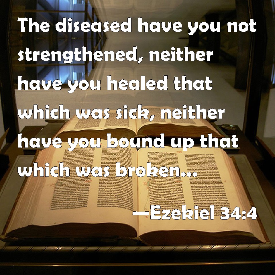 Choose a Background Ezekiel 34:4 The diseased have you not strengthened, neither have you healed that which was sick, neither have you bound up that which was broken, neither have you brought again that which was driven away, neither have you sought that which was lost; but with force and with cruelty have you ruled them. KJV: The diseased have ye not strengthened, neither have ye healed that which was sick, neither have ye bound up that which was broken, neither have ye brought again that which was driven away, neither have ye sought that which was lost; but with force and with cruelty have ye ruled them. DRB: The weak you have not strengthened, and that which was sick you have not healed, that which was broken you have not bound up, and that which was driven away you have not brought again, neither have you sought that which was lost: but you ruled over them with rigour, and with a high hand. DBT: The weak have ye not strengthened, nor have ye healed the sick, and ye have not bound up what was broken, neither have ye brought again that which was driven away, neither have ye sought for that which was lost; but with harshness and with rigour have ye ruled over them. ERV: The diseased have ye not strengthened, neither have ye healed that which was sick, neither have ye bound up that which was broken, neither have ye brought again that which was driven away, neither have ye sought that which was lost; but with force and with rigour have ye ruled over them. WBT: The diseased ye have not strengthened, neither have ye healed that which was sick, neither have ye bound up that which was broken, neither have ye brought again that which was driven away, neither have ye sought that which was lost; but with force and with cruelty have ye ruled them. WEB: You haven't strengthened the diseased, neither have you healed that which was sick, neither have you bound up that which was broken, neither have you brought back that which was driven away, neither have you sought that which was lost; but with force and with rigor you have ruled over them. YLT: The weak ye have not strengthened, And the sick one ye have not healed, And the broken ye have not bound up, And the driven away have not brought back, And the lost ye have not sought, And with might ye have ruled them and with rigour.Links Ezekiel 34:4 NIV • Ezekiel 34:4 NLT • Ezekiel 34:4 ESV • Ezekiel 34:4 NASB • Ezekiel 34:4 KJV • Ezekiel 34:4 Interlinear • Ezekiel 34:4 Commentaries • Ezekiel 34:4 Parallel Texts • Ezekiel 34:4 Bible Apps • Ezekiel 34:4 Parallel • Bible Hub |