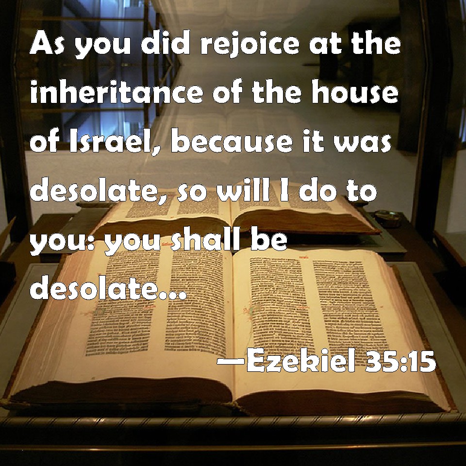 Choose a Background Ezekiel 35:15 As you did rejoice at the inheritance of the house of Israel, because it was desolate, so will I do to you: you shall be desolate, O mount Seir, and all Idumea, even all of it: and they shall know that I am the LORD. KJV: As thou didst rejoice at the inheritance of the house of Israel, because it was desolate, so will I do unto thee: thou shalt be desolate, O mount Seir, and all Idumea, even all of it: and they shall know that I am the LORD. DRB: As thou best rejoiced over the inheritance of the house of Israel, because it was laid waste, so will I do to thee: thou shalt be laid waste, O mount Seir, and all Idumea: and they shall know that I am the Lord. DBT: As thou didst rejoice at the inheritance of the house of Israel, because it was desolated, so will I do unto thee: thou shalt be a desolation, O mount Seir, and all Edom, the whole of it: and they shall know that I am Jehovah. ERV: As thou didst rejoice over the inheritance of the house of Israel, because it was desolate, so will I do unto thee: thou shalt be desolate, O mount Seir, and all Edom, even all of it: and they shall know that I am the LORD. WBT: As thou didst rejoice at the inheritance of the house of Israel, because it was desolate, so will I do to thee: thou shalt be desolate, O mount Seir, and all Edom, even all of it: and they shall know that I am the LORD. WEB: As you rejoiced over the inheritance of the house of Israel, because it was desolate, so will I do to you: you shall be desolate, Mount Seir, and all Edom, even all of it; and they shall know that I am Yahweh. YLT: According to thy joy at the inheritance of the house of Israel because of desolation, So I do to thee — a desolation thou art, O mount Seir, and all Edom — all of it, And they have known that I am Jehovah!Links Ezekiel 35:15 NIV • Ezekiel 35:15 NLT • Ezekiel 35:15 ESV • Ezekiel 35:15 NASB • Ezekiel 35:15 KJV • Ezekiel 35:15 Interlinear • Ezekiel 35:15 Commentaries • Ezekiel 35:15 Parallel Texts • Ezekiel 35:15 Bible Apps • Ezekiel 35:15 Parallel • Bible Hub |
