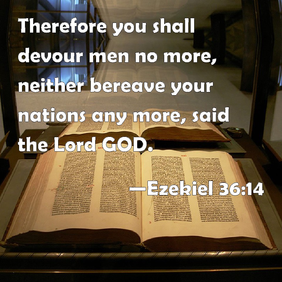 Choose a Background Ezekiel 36:14 Therefore you shall devour men no more, neither bereave your nations any more, said the Lord GOD. KJV: Therefore thou shalt devour men no more, neither bereave thy nations any more, saith the Lord GOD. DRB: Therefore thou shalt devour men no more, nor destroy thy nation any more, saith the Lord God: DBT: therefore thou shalt devour men no more, neither bereave thy nation any more, saith the Lord Jehovah; ERV: therefore thou shalt devour men no more, neither bereave thy nation any more, saith the Lord GOD; WBT: Therefore thou shalt devour men no more, neither bereave thy nations any more, saith the Lord GOD. WEB: therefore you shall devour men no more, neither bereave your nation any more, says the Lord Yahweh; YLT: Therefore, man thou devourest no more, And thy nations thou causest not to stumble any more, An affirmation of the Lord Jehovah.Links Ezekiel 36:14 NIV • Ezekiel 36:14 NLT • Ezekiel 36:14 ESV • Ezekiel 36:14 NASB • Ezekiel 36:14 KJV • Ezekiel 36:14 Interlinear • Ezekiel 36:14 Commentaries • Ezekiel 36:14 Parallel Texts • Ezekiel 36:14 Bible Apps • Ezekiel 36:14 Parallel • Bible Hub |