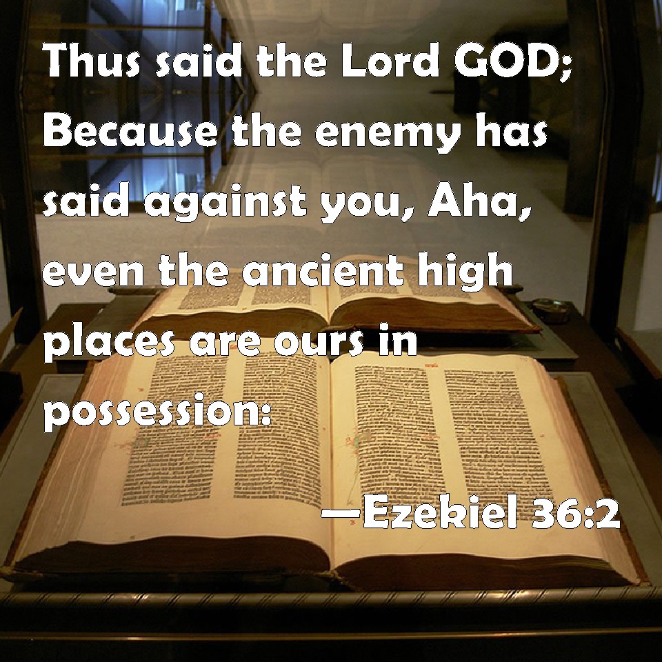 Choose a Background Ezekiel 36:2 Thus said the Lord GOD; Because the enemy has said against you, Aha, even the ancient high places are ours in possession: KJV: Thus saith the Lord GOD; Because the enemy hath said against you, Aha, even the ancient high places are ours in possession: DRB: Thus saith the Lord God: Because the enemy hath said of you: Aha, the everlasting heights are given to us for an inheritance. DBT: Thus saith the Lord Jehovah: Because the enemy hath said against you, Aha! and, The ancient high places are become ours in possession; ERV: Thus saith the Lord GOD: Because the enemy hath said against you, Aha! and, The ancient high places are ours in possession: WBT: Thus saith the Lord GOD; Because the enemy had said against you, Aha, even the ancient high places are ours in possession: WEB: Thus says the Lord Yahweh: Because the enemy has said against you, Aha! and, The ancient high places are ours in possession; YLT: Thus said the Lord Jehovah: Because the enemy said against you, Aha, and the high places of old for a possession have been to us,Links Ezekiel 36:2 NIV • Ezekiel 36:2 NLT • Ezekiel 36:2 ESV • Ezekiel 36:2 NASB • Ezekiel 36:2 KJV • Ezekiel 36:2 Interlinear • Ezekiel 36:2 Commentaries • Ezekiel 36:2 Parallel Texts • Ezekiel 36:2 Bible Apps • Ezekiel 36:2 Parallel • Bible Hub |