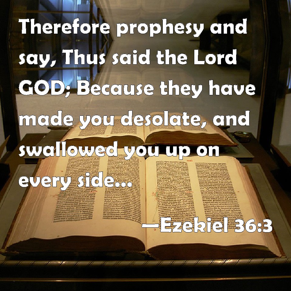 Choose a Background Ezekiel 36:3 Therefore prophesy and say, Thus said the Lord GOD; Because they have made you desolate, and swallowed you up on every side, that you might be a possession to the residue of the heathen, and you are taken up in the lips of talkers, and are an infamy of the people: KJV: Therefore prophesy and say, Thus saith the Lord GOD; Because they have made you desolate, and swallowed you up on every side, that ye might be a possession unto the residue of the heathen, and ye are taken up in the lips of talkers, and are an infamy of the people: DRB: Therefore prophesy, and say: Thus saith the Lord God: Because you have been desolate, and trodden under foot on every side, and made an inheritance to the rest of the nations, and are become the subject of the talk, and the reproach of the people: DBT: therefore prophesy and say, Thus saith the Lord Jehovah: Because, yea, because they have made you desolate, and have swallowed you up on every side, that ye might be a possession unto the remnant of the nations, and ye are taken up in the lips of talkers, and in the defaming of the people: ERV: therefore prophesy, and say, Thus saith the Lord GOD: Because, even because they have made you desolate, and swallowed you up on every side, that ye might be a possession unto the residue of the nations, and ye are taken up in the lips of talkers, and the evil report of the people: WBT: Therefore prophesy and say, Thus saith the Lord GOD; Because they have made you desolate, and swallowed you up on every side, that ye might be a possession to the residue of the heathen, and ye are taken up in the lips of talkers, and are an infamy of the people: WEB: therefore prophesy, and say, Thus says the Lord Yahweh: Because, even because they have made you desolate, and swallowed you up on every side, that you might be a possession to the residue of the nations, and you are taken up in the lips of talkers, and the evil report of the people; YLT: therefore, prophesy, and thou hast said: Thus said the Lord Jehovah: Because, even because, of desolating, And of swallowing you up from round about, For your being a possession to the remnant of the nations, And ye are taken up on the tip of the tongue, And are an evil report of the people.Links Ezekiel 36:3 NIV • Ezekiel 36:3 NLT • Ezekiel 36:3 ESV • Ezekiel 36:3 NASB • Ezekiel 36:3 KJV • Ezekiel 36:3 Interlinear • Ezekiel 36:3 Commentaries • Ezekiel 36:3 Parallel Texts • Ezekiel 36:3 Bible Apps • Ezekiel 36:3 Parallel • Bible Hub |