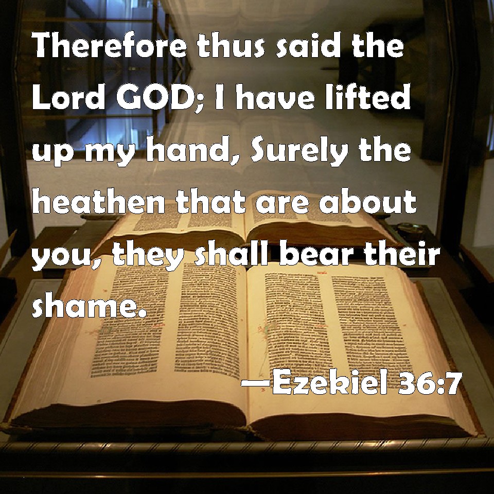 Choose a Background Ezekiel 36:7 Therefore thus said the Lord GOD; I have lifted up my hand, Surely the heathen that are about you, they shall bear their shame. KJV: Therefore thus saith the Lord GOD; I have lifted up mine hand, Surely the heathen that are about you, they shall bear their shame. DRB: Therefore thus saith the Lord God: I have lifted up my hand, that the Gentiles who are round about you, shall themselves bear their shame. DBT: therefore thus saith the Lord Jehovah: I have lifted up my hand, saying, Verily the nations that are about you, they shall bear their shame. ERV: therefore thus saith the Lord GOD: I have lifted up mine hand, saying, Surely the heathen that are round about you, they shall bear their shame. WBT: Therefore thus saith the Lord GOD; I have lifted up my hand, Surely the heathen that are about you, they shall bear their shame. WEB: therefore thus says the Lord Yahweh: I have sworn, [saying], Surely the nations that are around you, they shall bear their shame. YLT: Therefore, thus said the Lord Jehovah: I — I have lifted up My hand, Do not — the nations who are with you from round about — they their own shame bear?Links Ezekiel 36:7 NIV • Ezekiel 36:7 NLT • Ezekiel 36:7 ESV • Ezekiel 36:7 NASB • Ezekiel 36:7 KJV • Ezekiel 36:7 Interlinear • Ezekiel 36:7 Commentaries • Ezekiel 36:7 Parallel Texts • Ezekiel 36:7 Bible Apps • Ezekiel 36:7 Parallel • Bible Hub |