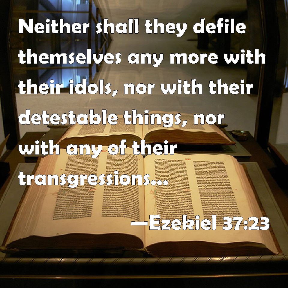 Choose a Background Ezekiel 37:23 Neither shall they defile themselves any more with their idols, nor with their detestable things, nor with any of their transgressions: but I will save them out of all their dwelling places, wherein they have sinned, and will cleanse them: so shall they be my people, and I will be their God. KJV: Neither shall they defile themselves any more with their idols, nor with their detestable things, nor with any of their transgressions: but I will save them out of all their dwellingplaces, wherein they have sinned, and will cleanse them: so shall they be my people, and I will be their God. DRB: Nor shall they be defiled any more with their idols, nor with their abominations, nor with all their iniquities: and I will save them out of all the places in which they have sinned, and I will cleanse them: and they shall be my people, and I will be their God. DBT: And they shall not defile themselves any more with their idols, or with their detestable things, or with any of their transgressions; and I will save them out of all their dwelling-places wherein they have sinned, and will cleanse them; and they shall be my people, and I will be their God. ERV: neither shall they defile themselves any more with their idols, nor with their detestable things, nor with any of their transgressions: but I will save them out of all their dwelling places, wherein they have sinned, and will cleanse them: so shall they be my people, and I will be their God. WBT: Neither shall they defile themselves any more with their idols, nor with their detestable things, nor with any of their transgressions: but I will save them out of all their dwelling-places, in which they have sinned, and will cleanse them: so shall they be my people, and I will be their God. WEB: neither shall they defile themselves any more with their idols, nor with their detestable things, nor with any of their transgressions; but I will save them out of all their dwelling places, in which they have sinned, and will cleanse them: so shall they be my people, and I will be their God. YLT: Nor are they defiled any more with their idols, And with their abominations, And with any of their transgressions, And I have saved them out of all their dwellings, In which they have sinned, And I have cleansed them, And they have been to Me for a people, And I — I am to them for God.Links Ezekiel 37:23 NIV • Ezekiel 37:23 NLT • Ezekiel 37:23 ESV • Ezekiel 37:23 NASB • Ezekiel 37:23 KJV • Ezekiel 37:23 Interlinear • Ezekiel 37:23 Commentaries • Ezekiel 37:23 Parallel Texts • Ezekiel 37:23 Bible Apps • Ezekiel 37:23 Parallel • Bible Hub |