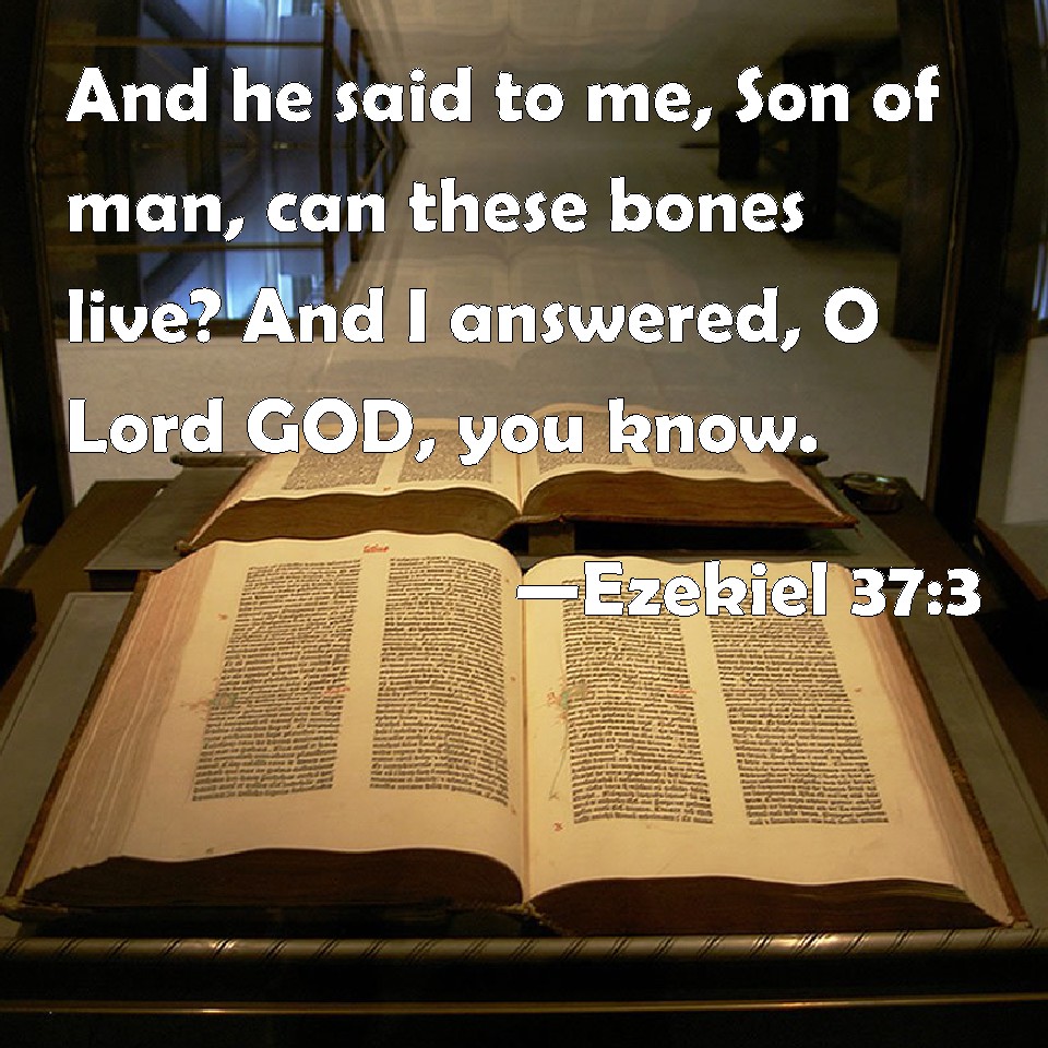 Choose a Background Ezekiel 37:3 And he said to me, Son of man, can these bones live? And I answered, O Lord GOD, you know. KJV: And he said unto me, Son of man, can these bones live? And I answered, O Lord GOD, thou knowest. DRB: And he said to me: Son of man, dost thou think these bones shall live? And I answered: O Lord God, thou knowest. DBT: And he said unto me, Son of man, Shall these bones live? And I said, Lord Jehovah, thou knowest. ERV: And he said unto me, Son of man, can these bones live? And I answered, O Lord GOD, thou knowest. WBT: And he said to me, Son of man, can these bones live? and I answered, O Lord GOD, thou knowest. WEB: He said to me, Son of man, can these bones live? I answered, Lord Yahweh, you know. YLT: And He saith unto me, 'Son of man, do these bones live?' And I say, 'O Lord Jehovah, Thou — Thou hast known.'Links Ezekiel 37:3 NIV • Ezekiel 37:3 NLT • Ezekiel 37:3 ESV • Ezekiel 37:3 NASB • Ezekiel 37:3 KJV • Ezekiel 37:3 Interlinear • Ezekiel 37:3 Commentaries • Ezekiel 37:3 Parallel Texts • Ezekiel 37:3 Bible Apps • Ezekiel 37:3 Parallel • Bible Hub |