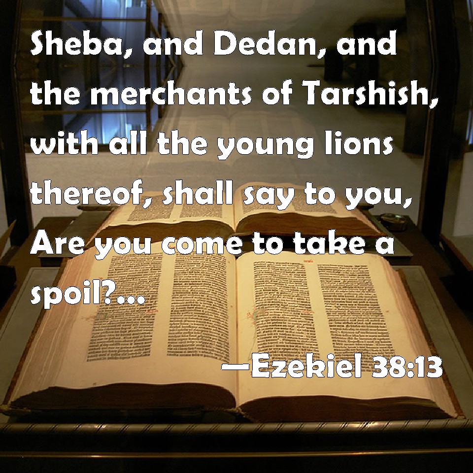 Choose a Background Ezekiel 38:13 Sheba, and Dedan, and the merchants of Tarshish, with all the young lions thereof, shall say to you, Are you come to take a spoil? have you gathered your company to take a prey? to carry away silver and gold, to take away cattle and goods, to take a great spoil? KJV: Sheba, and Dedan, and the merchants of Tarshish, with all the young lions thereof, shall say unto thee, Art thou come to take a spoil? hast thou gathered thy company to take a prey? to carry away silver and gold, to take away cattle and goods, to take a great spoil? DRB: Saba, and Dedan, and the merchants of Tharsis, and all the lions thereof shall say to thee: Art thou come to take spoils? behold, thou hast gathered thy multitude to take a prey, to take silver, and gold, and to carry away goods and substance, and to take rich spoils. DBT: Sheba, and Dedan, and the merchants of Tarshish, with all the young lions thereof, shall say unto thee, Art thou come to seize a spoil? hast thou gathered thine assemblage to take a prey? to carry away silver and gold, to take cattle and goods, to seize a great spoil? ERV: Sheba, and Dedan, and the merchants of Tarshish; with all the young lions thereof, shall say unto thee, Art thou come to take the spoil? hast thou assembled thy company to take the prey? to carry away silver and gold, to take away cattle and goods, to take great spoil? WBT: Sheba, and Dedan, and the merchants of Tarshish, with all its young lions, shall say to thee, Art thou come to take a spoil? hast thou gathered thy company to take a prey? to carry away silver and gold, to take away cattle and goods, to take a great spoil? WEB: Sheba, and Dedan, and the merchants of Tarshish, with all the young lions of it, shall tell you, Have you come to take the spoil? have you assembled your company to take the prey? to carry away silver and gold, to take away livestock and goods, to take great spoil? YLT: Sheba, and Dedan, and merchants of Tarshish, And all its young lions say to thee: To take a spoil art thou come in? To take a prey assembled thine assembly? To bear away silver and gold? To take away cattle and substance? To take a great spoil?Links Ezekiel 38:13 NIV • Ezekiel 38:13 NLT • Ezekiel 38:13 ESV • Ezekiel 38:13 NASB • Ezekiel 38:13 KJV • Ezekiel 38:13 Interlinear • Ezekiel 38:13 Commentaries • Ezekiel 38:13 Parallel Texts • Ezekiel 38:13 Bible Apps • Ezekiel 38:13 Parallel • Bible Hub |
