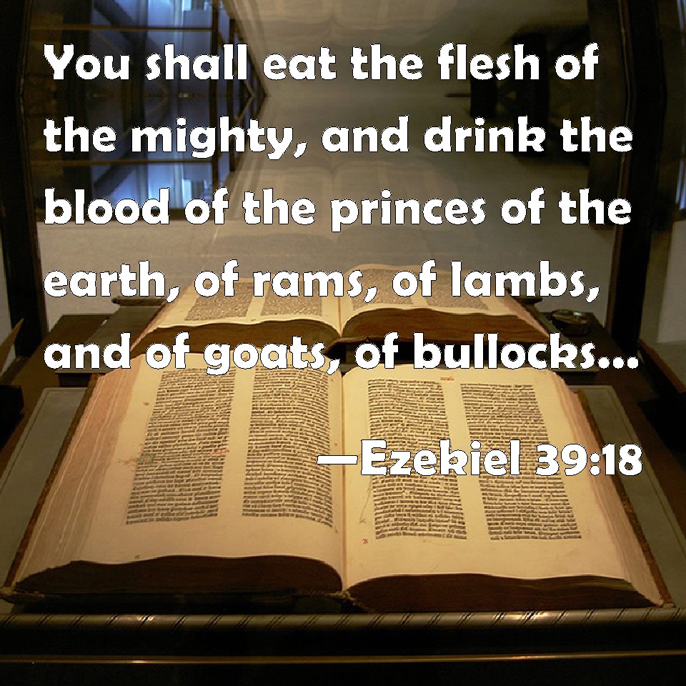 Choose a Background Ezekiel 39:18 You shall eat the flesh of the mighty, and drink the blood of the princes of the earth, of rams, of lambs, and of goats, of bullocks, all of them fatted calves of Bashan. KJV: Ye shall eat the flesh of the mighty, and drink the blood of the princes of the earth, of rams, of lambs, and of goats, of bullocks, all of them fatlings of Bashan. DRB: You shall eat the flesh of the mighty, and you shall drink the blood of the princes of the earth, of rams, and of lambs, and of he goats, and bullocks, and of all that are well fed and fat. DBT: Ye shall eat the flesh of the mighty, and drink the blood of the princes of the earth, of rams, of lambs, and of goats, and of bullocks, all of them fatted beasts of Bashan. ERV: Ye shall eat the flesh of the mighty, and drink the blood of the princes of the earth, of rams, of lambs, and of goats, of bullocks, all of them fatlings of Bashan. WBT: Ye shall eat the flesh of the mighty, and drink the blood of the princes of the earth, of rams, of lambs, and of goats, of bullocks, all of them fatlings of Bashan. WEB: You shall eat the flesh of the mighty, and drink the blood of the princes of the earth, of rams, of lambs, and of goats, of bulls, all of them fatlings of Bashan. YLT: Flesh of the mighty ye do eat, And blood of princes of the earth ye drink, Of rams, of lambs, and of he-goats, Of calves, fatlings of Bashan — all of them.Links Ezekiel 39:18 NIV • Ezekiel 39:18 NLT • Ezekiel 39:18 ESV • Ezekiel 39:18 NASB • Ezekiel 39:18 KJV • Ezekiel 39:18 Interlinear • Ezekiel 39:18 Commentaries • Ezekiel 39:18 Parallel Texts • Ezekiel 39:18 Bible Apps • Ezekiel 39:18 Parallel • Bible Hub |