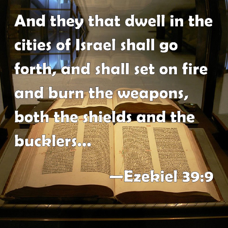 Choose a Background Ezekiel 39:9 And they that dwell in the cities of Israel shall go forth, and shall set on fire and burn the weapons, both the shields and the bucklers, the bows and the arrows, and the hand staves, and the spears, and they shall burn them with fire seven years: KJV: And they that dwell in the cities of Israel shall go forth, and shall set on fire and burn the weapons, both the shields and the bucklers, the bows and the arrows, and the handstaves, and the spears, and they shall burn them with fire seven years: DRB: And the inhabitants shall go forth of the cities of Israel, and shall set on fire and burn the weapons, the shields, and the spears, the bows and the arrows, and the handstaves and the pikes: and they shall burn them with fire seven years. DBT: And they that dwell in the cities of Israel shall go forth, and shall kindle fire, and burn weapons, and shields, and targets, bows, and arrows, and hand-staves, and spears: and they shall make fires with them seven years. ERV: And they that dwell in the cities of Israel shall go forth, and shall make fires of the weapons and burn them, both the shields and the bucklers, the bows and the arrows, and the handstaves, and the spears, and they shall make fires of them seven years. WBT: And they that dwell in the cities of Israel shall go forth, and shall set on fire and burn the weapons, both the shields and the bucklers, the bows and the arrows, and the handstaffs, and the spears, and they shall burn them with fire seven years: WEB: Those who dwell in the cities of Israel shall go forth, and shall make fires of the weapons and burn them, both the shields and the bucklers, the bows and the arrows, and the war clubs, and the spears, and they shall make fires of them seven years; YLT: And gone out have the inhabitants of cities of Israel, And they have burned and kindled a fire, With armour, and shield, and buckler, With bow, and with arrows, And with hand-staves, and with javelins, And they have caused a fire to burn with them seven years,Links Ezekiel 39:9 NIV • Ezekiel 39:9 NLT • Ezekiel 39:9 ESV • Ezekiel 39:9 NASB • Ezekiel 39:9 KJV • Ezekiel 39:9 Interlinear • Ezekiel 39:9 Commentaries • Ezekiel 39:9 Parallel Texts • Ezekiel 39:9 Bible Apps • Ezekiel 39:9 Parallel • Bible Hub |
