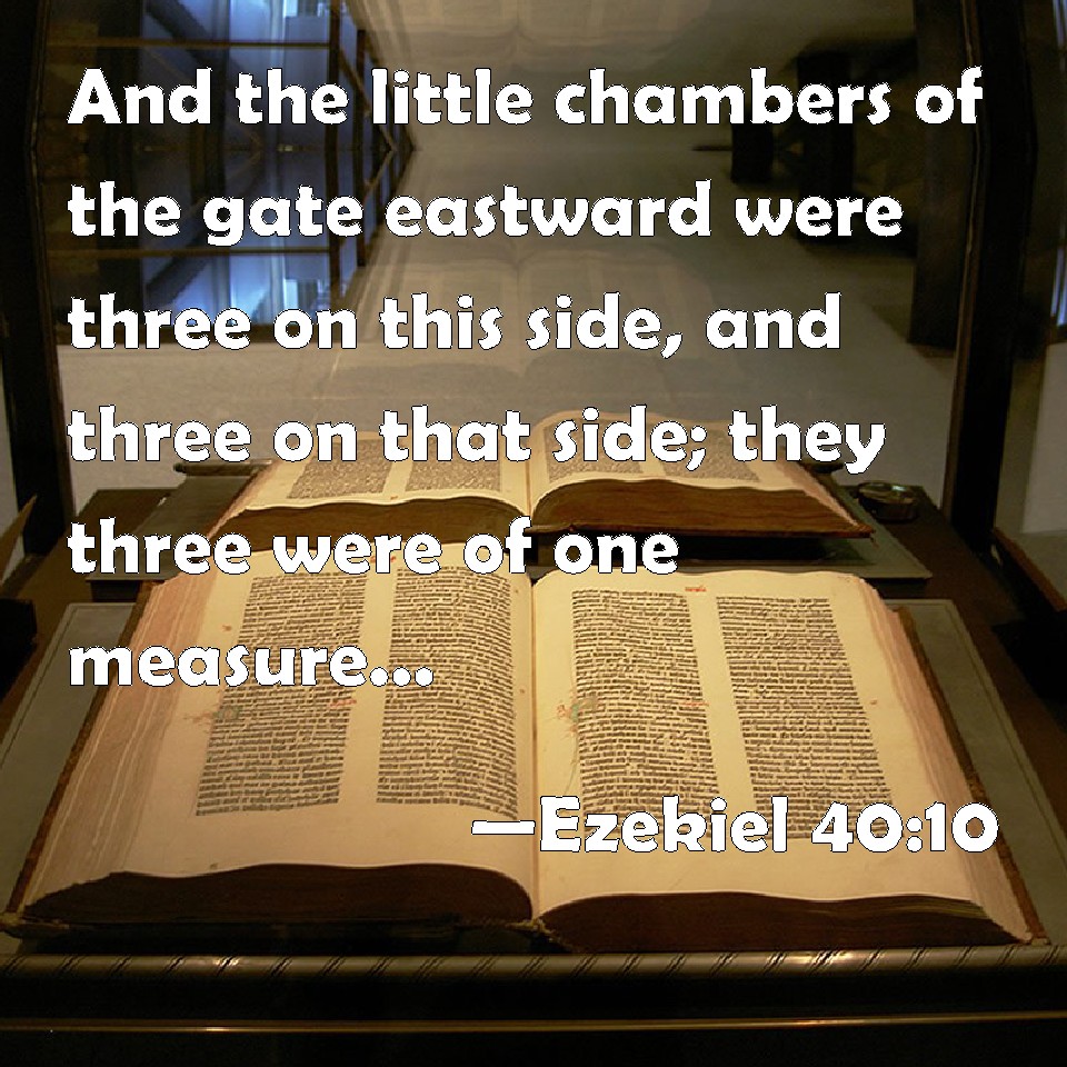 Choose a Background Ezekiel 40:10 And the little chambers of the gate eastward were three on this side, and three on that side; they three were of one measure: and the posts had one measure on this side and on that side. KJV: And the little chambers of the gate eastward were three on this side, and three on that side; they three were of one measure: and the posts had one measure on this side and on that side. DRB: And the little chambers of the gate that looked eastward were three on this side, and three on that side: all three were of one measure, and the fronts of one measure, on both parts. DBT: And the chambers of the gate which was toward the east were three on this side and three on that side: they three were of one measure; and the posts on this side and on that side had one measure. ERV: And the lodges of the gate eastward were three on this side, and three on that side; they three were of one measure: and the posts had one measure on this side and on that side. WBT: And the little chambers of the gate eastward were three on this side, and three on that side; they three were of one measure: and the posts had one measure on this side and on that side. WEB: The lodges of the gate eastward were three on this side, and three on that side; they three were of one measure: and the posts had one measure on this side and on that side. YLT: and the little chambers of the gate eastward, three on this side, and three on that side; one measure is to them three, and one measure is to the posts, on this side and on that side.Links Ezekiel 40:10 NIV • Ezekiel 40:10 NLT • Ezekiel 40:10 ESV • Ezekiel 40:10 NASB • Ezekiel 40:10 KJV • Ezekiel 40:10 Interlinear • Ezekiel 40:10 Commentaries • Ezekiel 40:10 Parallel Texts • Ezekiel 40:10 Bible Apps • Ezekiel 40:10 Parallel • Bible Hub |