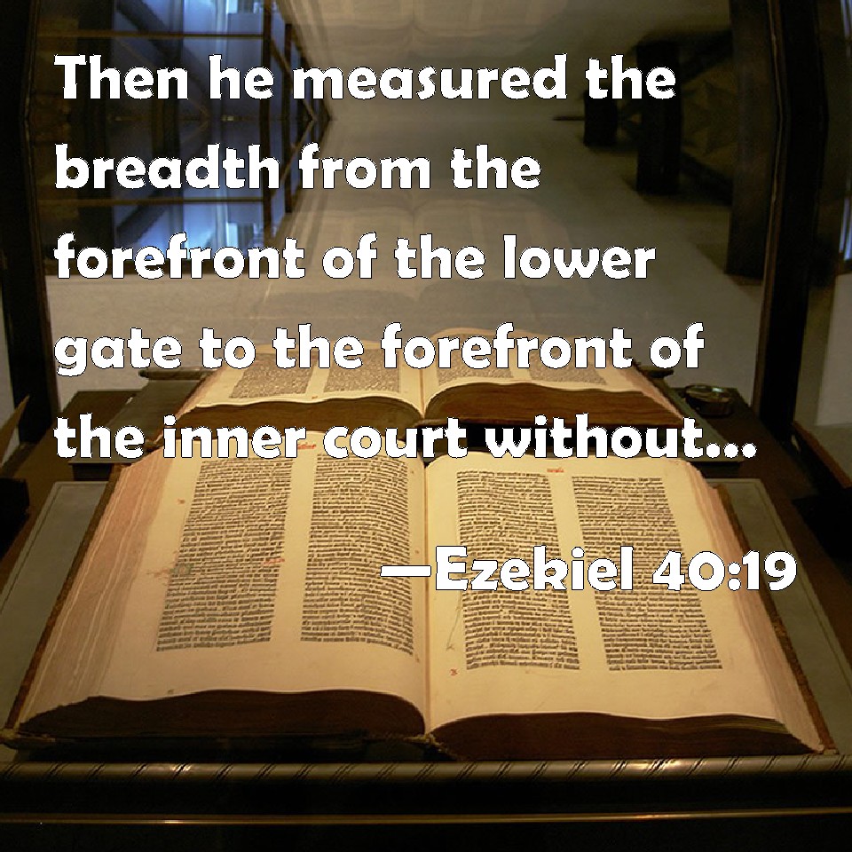 Choose a Background Ezekiel 40:19 Then he measured the breadth from the forefront of the lower gate to the forefront of the inner court without, an hundred cubits eastward and northward. KJV: Then he measured the breadth from the forefront of the lower gate unto the forefront of the inner court without, an hundred cubits eastward and northward. DRB: And he measured the breadth from the face of the lower gate to the front of the inner court without, a hundred cubits to the east, and to the north. DBT: And he measured the breadth from the front of the lower gate unto the front of the inner court outside, a hundred cubits eastward and northward. ERV: Then he measured the breadth from the forefront of the lower gate unto the forefront of the inner court without, an hundred cubits, both on the east and on the north. WBT: Then he measured the breadth from the front of the lower gate to the front of the inner court without, a hundred cubits eastward and northward. WEB: Then he measured the breadth from the forefront of the lower gate to the forefront of the inner court outside, one hundred cubits, [both] on the east and on the north. YLT: and he measureth the breadth from before the lower gate, to the front of the inner court, on the outside, a hundred cubits, eastward and northward.Links Ezekiel 40:19 NIV • Ezekiel 40:19 NLT • Ezekiel 40:19 ESV • Ezekiel 40:19 NASB • Ezekiel 40:19 KJV • Ezekiel 40:19 Interlinear • Ezekiel 40:19 Commentaries • Ezekiel 40:19 Parallel Texts • Ezekiel 40:19 Bible Apps • Ezekiel 40:19 Parallel • Bible Hub |