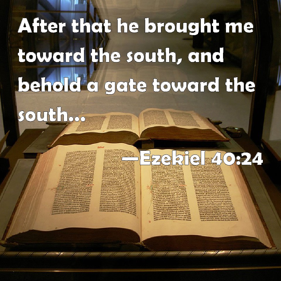 Choose a Background Ezekiel 40:24 After that he brought me toward the south, and behold a gate toward the south: and he measured the posts thereof and the arches thereof according to these measures. KJV: After that he brought me toward the south, and behold a gate toward the south: and he measured the posts thereof and the arches thereof according to these measures. DRB: And he brought me out to the way of the south, and behold the gate that looked to the south : and he measured the front thereof, and the porch thereof according to the former measures. DBT: And he brought me toward the south: and behold, there was a gate toward the south; and he measured its posts and its projections according to these measures. ERV: And he led me toward the south, and behold a gate toward the south: and he measured the posts thereof and the arches thereof according to these measures. WBT: After that he brought me towards the south, and behold a gate towards the south: and he measured its posts and its arches according to these measures. WEB: He led me toward the south; and behold, a gate toward the south: and he measured its posts and its arches according to these measures. YLT: And he causeth me to go southward, and lo, a gate southward, and he hath measured its posts and its arches according to these measures;Links Ezekiel 40:24 NIV • Ezekiel 40:24 NLT • Ezekiel 40:24 ESV • Ezekiel 40:24 NASB • Ezekiel 40:24 KJV • Ezekiel 40:24 Interlinear • Ezekiel 40:24 Commentaries • Ezekiel 40:24 Parallel Texts • Ezekiel 40:24 Bible Apps • Ezekiel 40:24 Parallel • Bible Hub |