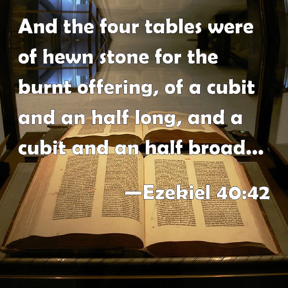 Choose a Background Ezekiel 40:42 And the four tables were of hewn stone for the burnt offering, of a cubit and an half long, and a cubit and an half broad, and one cubit high: whereupon also they laid the instruments with which they slew the burnt offering and the sacrifice. KJV: And the four tables were of hewn stone for the burnt offering, of a cubit and an half long, and a cubit and an half broad, and one cubit high: whereupon also they laid the instruments wherewith they slew the burnt offering and the sacrifice. DRB: And the four tables for the holocausts were made of square stones: one cubit and a half long, and one cubit and a half broad, and one cubit high: to lay the vessels upon, in which the holocaust and the victim is slain. DBT: and at the ascent, four tables of hewn stone, of a cubit and a half long, and a cubit and a half broad, and one cubit high; whereon also they laid the instruments with which they slew the burnt-offering and the sacrifice. ERV: And there were four tables for the burnt offering, of hewn stone, a cubit and an half long, and a cubit and an half broad, and one cubit high: whereupon they laid the instruments wherewith they slew the burnt offering and the sacrifice. WBT: And the four tables were of hewn stone for the burnt-offering, of a cubit and a half long, and a cubit and a half broad, and one cubit high: upon which also they laid the instruments with which they slew the burnt-offering and the sacrifice. WEB: There were four tables for the burnt offering, of cut stone, a cubit and a half long, and a cubit and a half broad, and one cubit high; whereupon they laid the instruments with which they killed the burnt offering and the sacrifice. YLT: And the four tables for burnt-offering are of hewn stone: the length one cubit and a half, and the breadth one cubit and a half, and the height one cubit: on them they place the instruments with which they slaughter the burnt-offering and the sacrifice.Links Ezekiel 40:42 NIV • Ezekiel 40:42 NLT • Ezekiel 40:42 ESV • Ezekiel 40:42 NASB • Ezekiel 40:42 KJV • Ezekiel 40:42 Interlinear • Ezekiel 40:42 Commentaries • Ezekiel 40:42 Parallel Texts • Ezekiel 40:42 Bible Apps • Ezekiel 40:42 Parallel • Bible Hub |