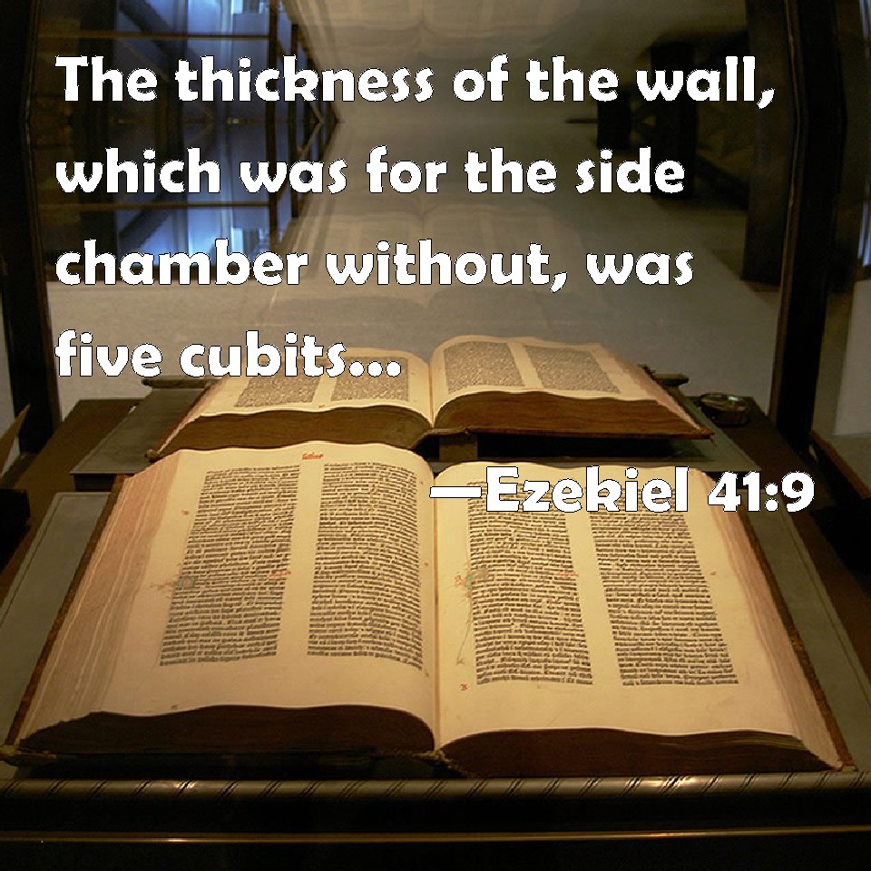 Choose a Background Ezekiel 41:9 The thickness of the wall, which was for the side chamber without, was five cubits: and that which was left was the place of the side chambers that were within. KJV: The thickness of the wall, which was for the side chamber without, was five cubits: and that which was left was the place of the side chambers that were within. DRB: And the thickness of the wall for the side chamber without, which was five cubits: and the inner house was within the side chambers of the house. DBT: The thickness of the wall, which was for the side-chambers without, was five cubits, as also what was left free along the building of the side-chambers that pertained to the house. ERV: The thickness of the wall, which was for the side chambers, on the outside, was five cubits: and that which was left was the place of the side-chambers that belonged to the house. WBT: The thickness of the wall, which was for the side-chamber without, was five cubits: and that which was left was the place of the side-chambers that were within. WEB: The thickness of the wall, which was for the side rooms, on the outside, was five cubits: and that which was left was the place of the side rooms that belonged to the house. YLT: The breadth of the wall that is to the side-chamber at the outside is five cubits; and that which is left is the place of the side-chambers that are to the house.Links Ezekiel 41:9 NIV • Ezekiel 41:9 NLT • Ezekiel 41:9 ESV • Ezekiel 41:9 NASB • Ezekiel 41:9 KJV • Ezekiel 41:9 Interlinear • Ezekiel 41:9 Commentaries • Ezekiel 41:9 Parallel Texts • Ezekiel 41:9 Bible Apps • Ezekiel 41:9 Parallel • Bible Hub |
