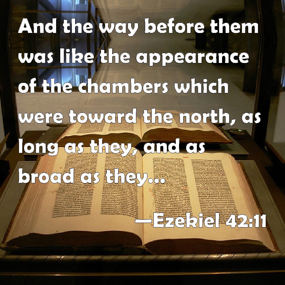 Choose a Background Ezekiel 42:11 And the way before them was like the appearance of the chambers which were toward the north, as long as they, and as broad as they: and all their goings out were both according to their fashions, and according to their doors. KJV: And the way before them was like the appearance of the chambers which were toward the north, as long as they, and as broad as they: and all their goings out were both according to their fashions, and according to their doors. DRB: And the way before them was like the chambers which were toward the north: they wore as long as they, and as broad as they: and all the going is to them, and their fashions, and their doors were alike. DBT: and a passage before them, like the appearance of the cells that were toward the north, according to their length, according to their breadth and all their goings out, and according to their fashions, and according to their doors. ERV: And the way before them was like the appearance of the way of the chambers which were toward the north; according to their length so was their breadth: and all their goings out were both according to their fashions, and according to their doors. WBT: And the way before them was like the appearance of the chambers which were towards the north, as long as they, and as broad as they: and all their goings out were both according to their fashions, and according to their doors. WEB: The way before them was like the appearance of [the way of] the rooms which were toward the north; according to their length so was their breadth: and all their exits were both according to their fashions, and according to their doors. YLT: And the way before them is as the appearance of the chambers that are northward, according to their length so is their breadth, and all their outlets, and according to their fashions, and according to their openings.Links Ezekiel 42:11 NIV • Ezekiel 42:11 NLT • Ezekiel 42:11 ESV • Ezekiel 42:11 NASB • Ezekiel 42:11 KJV • Ezekiel 42:11 Interlinear • Ezekiel 42:11 Commentaries • Ezekiel 42:11 Parallel Texts • Ezekiel 42:11 Bible Apps • Ezekiel 42:11 Parallel • Bible Hub |