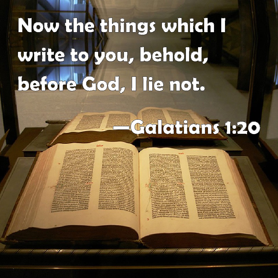Choose a Background Galatians 1:20 Now the things which I write to you, behold, before God, I lie not. KJV: Now the things which I write unto you, behold, before God, I lie not. DRB: Now the things which I write to you, behold, before God, I lie not. DBT: Now what I write to you, behold, before God, I do not lie. ERV: Now touching the things which I write unto you, behold, before God, I lie not. WBT: Now the things which I write to you, behold, before God, I lie not. WEB: Now about the things which I write to you, behold, before God, I'm not lying. YLT: And the things that I write to you, lo, before God — I lie not;Links Galatians 1:20 NIV • Galatians 1:20 NLT • Galatians 1:20 ESV • Galatians 1:20 NASB • Galatians 1:20 KJV • Galatians 1:20 Interlinear • Galatians 1:20 Commentaries • Galatians 1:20 Parallel Texts • Galatians 1:20 Bible Apps • Galatians 1:20 Parallel • Bible Hub |