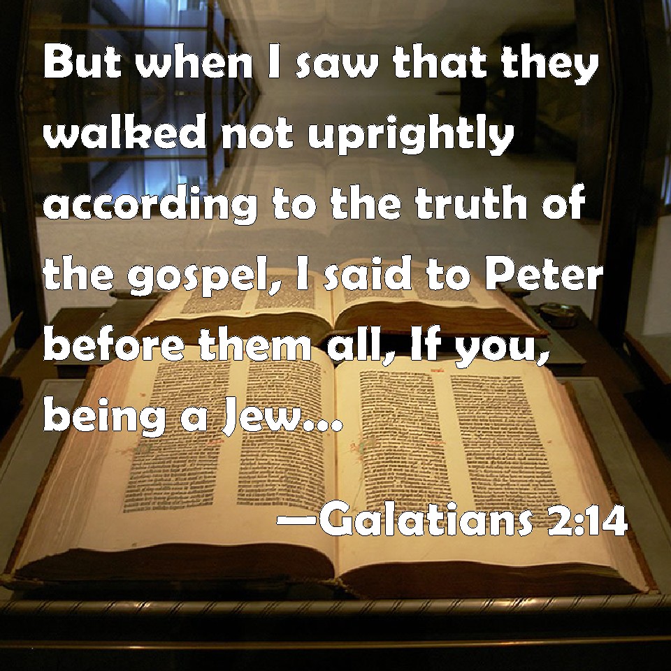 Choose a Background Galatians 2:14 But when I saw that they walked not uprightly according to the truth of the gospel, I said to Peter before them all, If you, being a Jew, live after the manner of Gentiles, and not as do the Jews, why compel you the Gentiles to live as do the Jews? KJV: But when I saw that they walked not uprightly according to the truth of the gospel, I said unto Peter before them all, If thou, being a Jew, livest after the manner of Gentiles, and not as do the Jews, why compellest thou the Gentiles to live as do the Jews? DRB: But when I saw that they walked not uprightly unto the truth of the gospel, I said to Cephas before them all: If thou, being a Jew, livest after the manner of the Gentiles, and not as the Jews do, how dost thou compel the Gentiles to live as do the Jews? DBT: But when I saw that they do not walk straightforwardly, according to the truth of the glad tidings, I said to Peter before all, If thou, being a Jew, livest as the nations and not as the Jews, how dost thou compel the nations to Judaize? ERV: But when I saw that they walked not uprightly according to the truth of the gospel, I said unto Cephas before them all, If thou, being a Jew, livest as do the Gentiles, and not as do the Jews, how compellest thou the Gentiles to live as do the Jews? WBT: But when I saw that they walked not uprightly according to the truth of the gospel, I said to Peter before them all, If thou, being a Jew, livest after the manner of Gentiles, and not as do the Jews, why compellest thou the Gentiles to live as do the Jews? WEB: But when I saw that they didn't walk uprightly according to the truth of the Good News, I said to Peter before them all, "If you, being a Jew, live as the Gentiles do, and not as the Jews do, why do you compel the Gentiles to live as the Jews do? YLT: But when I saw that they are not walking uprightly to the truth of the good news, I said to Peter before all, 'If thou, being a Jew, in the manner of the nations dost live, and not in the manner of the Jews, how the nations dost thou compel to Judaize?Links Galatians 2:14 NIV • Galatians 2:14 NLT • Galatians 2:14 ESV • Galatians 2:14 NASB • Galatians 2:14 KJV • Galatians 2:14 Interlinear • Galatians 2:14 Commentaries • Galatians 2:14 Parallel Texts • Galatians 2:14 Bible Apps • Galatians 2:14 Parallel • Bible Hub |