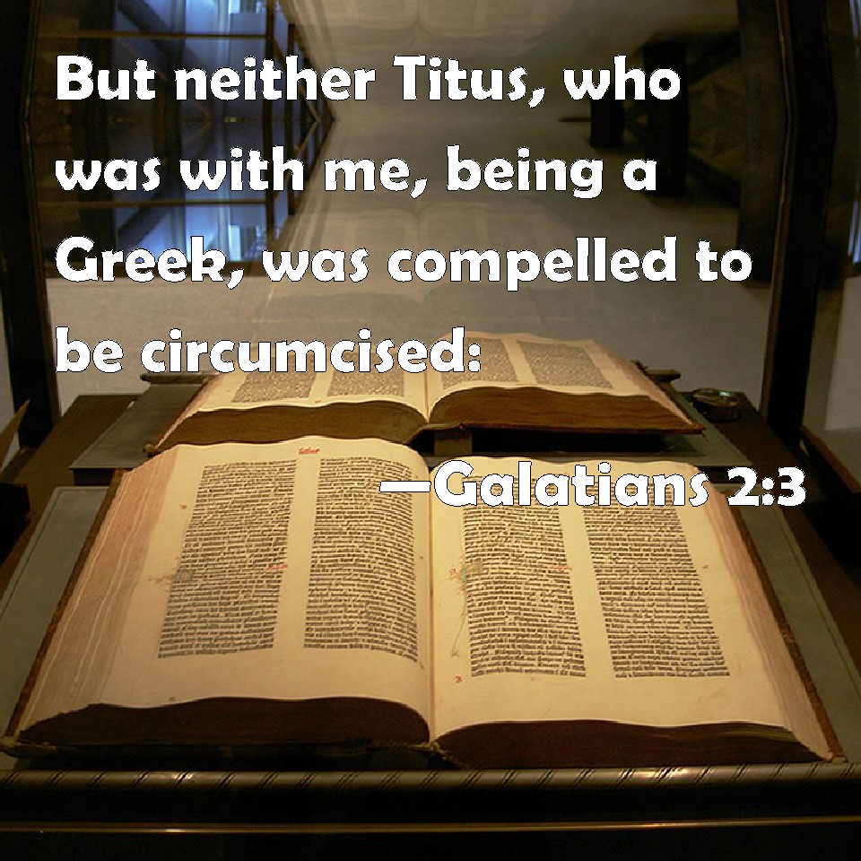 Choose a Background Galatians 2:3 But neither Titus, who was with me, being a Greek, was compelled to be circumcised: KJV: But neither Titus, who was with me, being a Greek, was compelled to be circumcised: DRB: But neither Titus, who was with me, being a Gentile, was compelled to be circumcised. DBT: (but neither was Titus, who was with me, being a Greek, compelled to be circumcised;) ERV: But not even Titus who was with me, being a Greek, was compelled to be circumcised: WBT: But neither Titus, who was with me, being a Greek, was compelled to be circumcised: WEB: But not even Titus, who was with me, being a Greek, was compelled to be circumcised. YLT: but not even Titus, who is with me, being a Greek, was compelled to be circumcised — Links Galatians 2:3 NIV • Galatians 2:3 NLT • Galatians 2:3 ESV • Galatians 2:3 NASB • Galatians 2:3 KJV • Galatians 2:3 Interlinear • Galatians 2:3 Commentaries • Galatians 2:3 Parallel Texts • Galatians 2:3 Bible Apps • Galatians 2:3 Parallel • Bible Hub |
