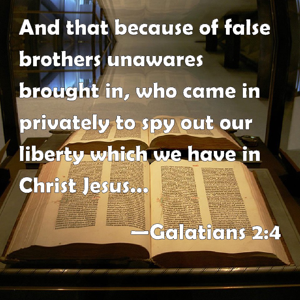 Choose a Background Galatians 2:4 And that because of false brothers unawares brought in, who came in privately to spy out our liberty which we have in Christ Jesus, that they might bring us into bondage: KJV: And that because of false brethren unawares brought in, who came in privily to spy out our liberty which we have in Christ Jesus, that they might bring us into bondage: DRB: But because of false brethren unawares brought in, who came in privately to spy our liberty, which we have in Christ Jesus, that they might bring us into servitude. DBT: and it was on account of the false brethren brought in surreptitiously, who came in surreptitiously to spy out our liberty which we have in Christ Jesus, that they might bring us into bondage; ERV: and that because of the false brethren privily brought in, who came in privily to spy out our liberty which we have in Christ Jesus, that they might bring us into bondage: WBT: And that because of false brethren unawares brought in, who came in privately to spy out our liberty which we have in Christ Jesus, that they might bring us into bondage: WEB: This was because of the false brothers secretly brought in, who stole in to spy out our liberty which we have in Christ Jesus, that they might bring us into bondage; YLT: and that because of the false brethren brought in unawares, who did come in privily to spy out our liberty that we have in Christ Jesus, that us they might bring under bondage,Links Galatians 2:4 NIV • Galatians 2:4 NLT • Galatians 2:4 ESV • Galatians 2:4 NASB • Galatians 2:4 KJV • Galatians 2:4 Interlinear • Galatians 2:4 Commentaries • Galatians 2:4 Parallel Texts • Galatians 2:4 Bible Apps • Galatians 2:4 Parallel • Bible Hub |