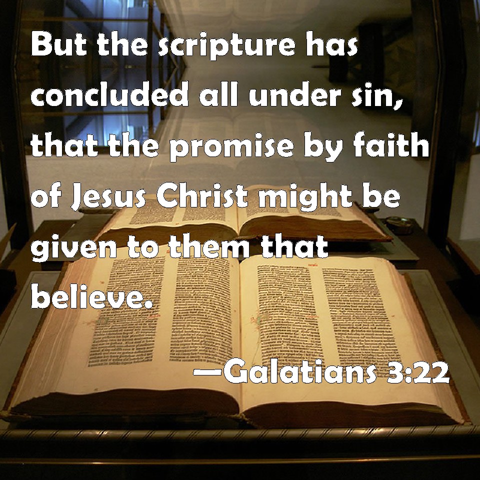 Choose a Background Galatians 3:22 But the scripture has concluded all under sin, that the promise by faith of Jesus Christ might be given to them that believe. KJV: But the scripture hath concluded all under sin, that the promise by faith of Jesus Christ might be given to them that believe. DRB: But the scripture hath concluded all under sin, that the promise, by the faith of Jesus Christ, might be given to them that believe. DBT: but the scripture has shut up all things under sin, that the promise, on the principle of faith of Jesus Christ, should be given to those that believe. ERV: Howbeit the scripture hath shut up all things under sin, that the promise by faith in Jesus Christ might be given to them that believe. WBT: But the scripture hath concluded all under sin, that the promise by faith of Jesus Christ might be given to them that believe. WEB: But the Scriptures imprisoned all things under sin, that the promise by faith in Jesus Christ might be given to those who believe. YLT: but the Writing did shut up the whole under sin, that the promise by faith of Jesus Christ may be given to those believing.Links Galatians 3:22 NIV • Galatians 3:22 NLT • Galatians 3:22 ESV • Galatians 3:22 NASB • Galatians 3:22 KJV • Galatians 3:22 Interlinear • Galatians 3:22 Commentaries • Galatians 3:22 Parallel Texts • Galatians 3:22 Bible Apps • Galatians 3:22 Parallel • Bible Hub |
