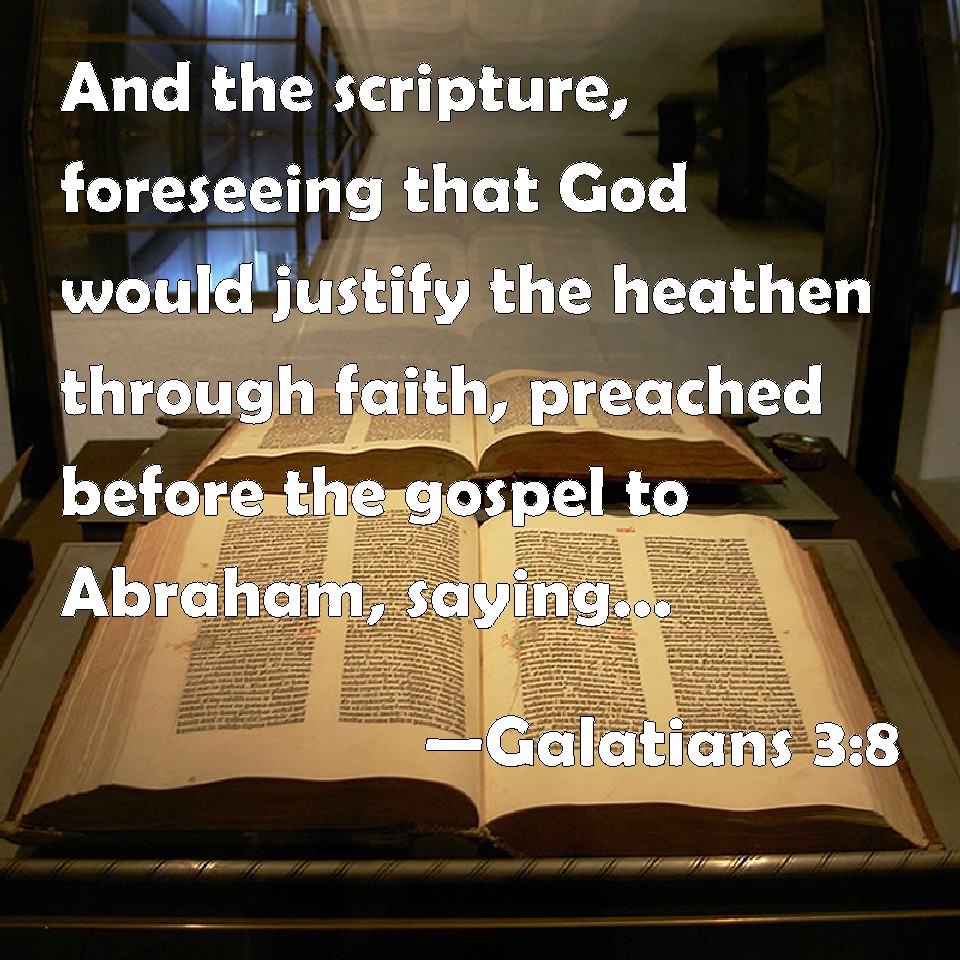 Choose a Background Galatians 3:8 And the scripture, foreseeing that God would justify the heathen through faith, preached before the gospel to Abraham, saying, In you shall all nations be blessed. KJV: And the scripture, foreseeing that God would justify the heathen through faith, preached before the gospel unto Abraham, saying, In thee shall all nations be blessed. DRB: And the scripture, foreseeing, that God justifieth the Gentiles by faith, told unto Abraham before: In thee shall all nations be blessed. DBT: and the scripture, foreseeing that God would justify the nations on the principle of faith, announced beforehand the glad tidings to Abraham: In thee all the nations shall be blessed. ERV: And the scripture, foreseeing that God would justify the Gentiles by faith, preached the gospel beforehand unto Abraham, saying, In thee shall all the nations be blessed. WBT: And the scripture foreseeing that God would justify the heathen through faith, preached before the gospel to Abraham, saying, In thee shall all nations be blessed. WEB: The Scripture, foreseeing that God would justify the Gentiles by faith, preached the Good News beforehand to Abraham, saying, "In you all the nations will be blessed." YLT: and the Writing having foreseen that by faith God doth declare righteous the nations did proclaim before the good news to Abraham — Links Galatians 3:8 NIV • Galatians 3:8 NLT • Galatians 3:8 ESV • Galatians 3:8 NASB • Galatians 3:8 KJV • Galatians 3:8 Interlinear • Galatians 3:8 Commentaries • Galatians 3:8 Parallel Texts • Galatians 3:8 Bible Apps • Galatians 3:8 Parallel • Bible Hub |