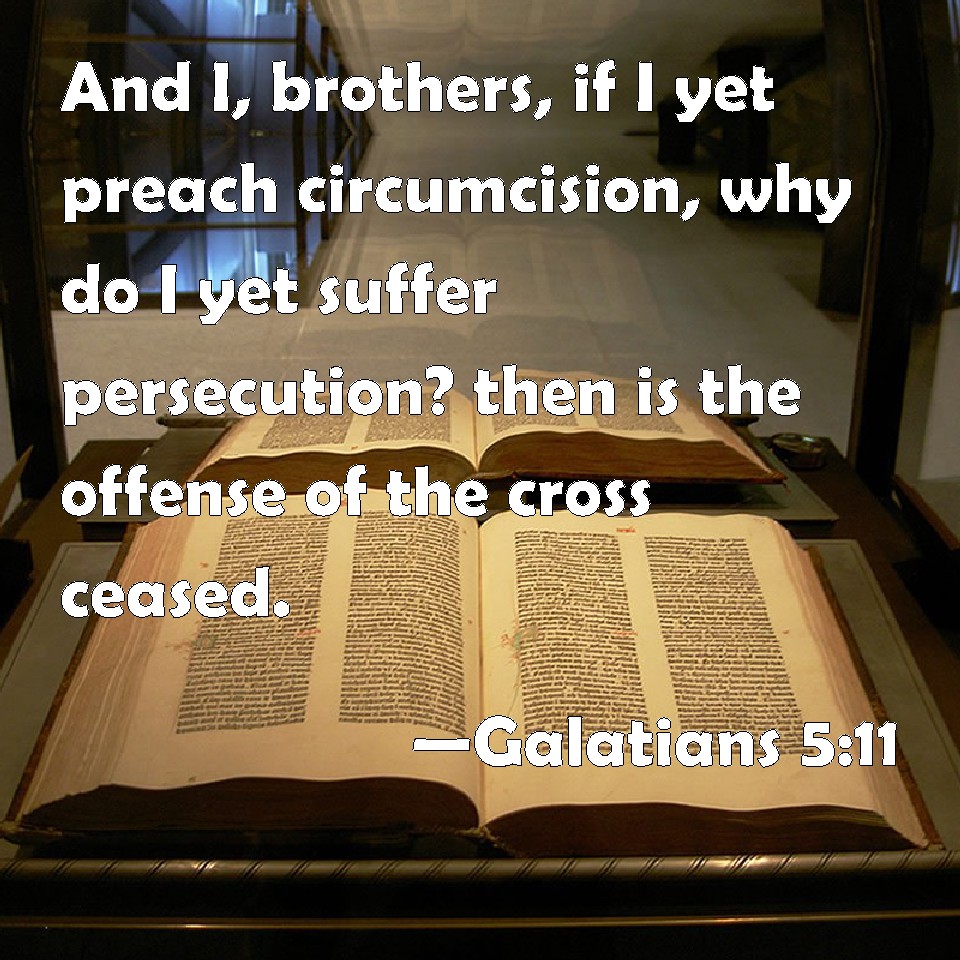 Choose a Background Galatians 5:11 And I, brothers, if I yet preach circumcision, why do I yet suffer persecution? then is the offense of the cross ceased. KJV: And I, brethren, if I yet preach circumcision, why do I yet suffer persecution? then is the offence of the cross ceased. DRB: And I, brethren, if I yet preach circumcision, why do I yet suffer persecution? Then is the scandal of the cross made void. DBT: But I, brethren, if I yet preach circumcision, why am I yet persecuted? Then the scandal of the cross has been done away. ERV: But I, brethren, if I still preach circumcision, why am I still persecuted? then hath the stumblingblock of the cross been done away. WBT: And I, brethren, if I yet preach circumcision, why do I yet suffer persecution? then hath the offense of the cross ceased. WEB: But I, brothers, if I still preach circumcision, why am I still persecuted? Then the stumbling block of the cross has been removed. YLT: And I, brethren, if uncircumcision I yet preach, why yet am I persecuted? then hath the stumbling-block of the cross been done away;Links Galatians 5:11 NIV • Galatians 5:11 NLT • Galatians 5:11 ESV • Galatians 5:11 NASB • Galatians 5:11 KJV • Galatians 5:11 Interlinear • Galatians 5:11 Commentaries • Galatians 5:11 Parallel Texts • Galatians 5:11 Bible Apps • Galatians 5:11 Parallel • Bible Hub |