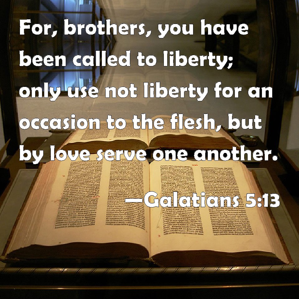 Choose a Background Galatians 5:13 For, brothers, you have been called to liberty; only use not liberty for an occasion to the flesh, but by love serve one another. KJV: For, brethren, ye have been called unto liberty; only use not liberty for an occasion to the flesh, but by love serve one another. DRB: For you, brethren, have been called unto liberty: only make not liberty an occasion to the flesh, but by charity of the spirit serve one another. DBT: For ye have been called to liberty, brethren; only do not turn liberty into an opportunity to the flesh, but by love serve one another. ERV: For ye, brethren, were called for freedom; only use not your freedom for an occasion to the flesh, but through love be servants one to another. WBT: For, brethren, ye have been called to liberty; only use not liberty for an occasion to the flesh, but by love serve one another. WEB: For you, brothers, were called for freedom. Only don't use your freedom for gain to the flesh, but through love be servants to one another. YLT: For ye — to freedom ye were called, brethren, only not the freedom for an occasion to the flesh, but through the love serve ye one another,Links Galatians 5:13 NIV • Galatians 5:13 NLT • Galatians 5:13 ESV • Galatians 5:13 NASB • Galatians 5:13 KJV • Galatians 5:13 Interlinear • Galatians 5:13 Commentaries • Galatians 5:13 Parallel Texts • Galatians 5:13 Bible Apps • Galatians 5:13 Parallel • Bible Hub |
