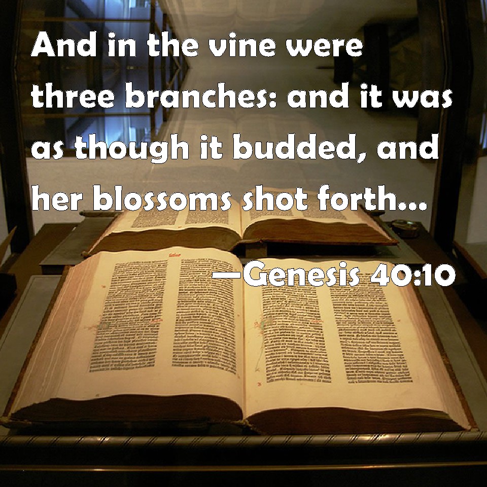 Choose a Background Genesis 40:10 And in the vine were three branches: and it was as though it budded, and her blossoms shot forth; and the clusters thereof brought forth ripe grapes: KJV: And in the vine were three branches: and it was as though it budded, and her blossoms shot forth; and the clusters thereof brought forth ripe grapes: DRB: On which were three branches, which by little and little sent out buds, and after the blossoms brought forth ripe grapes : DBT: and in the vine were three branches; and it was as though it budded: its blossoms shot forth, its clusters ripened into grapes. ERV: and in the vine were three branches: and it was as though it budded, and its blossoms shot forth; and the clusters thereof brought forth ripe grapes: WBT: And on the vine were three branches: and it was as though it budded, and its blossoms shot forth; and its clusters brought forth ripe grapes: WEB: and in the vine were three branches. It was as though it budded, its blossoms shot forth, and its clusters brought forth ripe grapes. YLT: and in the vine are three branches, and it is as it were flourishing; gone up hath its blossom, its clusters have ripened grapes;Links Genesis 40:10 NIV • Genesis 40:10 NLT • Genesis 40:10 ESV • Genesis 40:10 NASB • Genesis 40:10 KJV • Genesis 40:10 Interlinear • Genesis 40:10 Commentaries • Genesis 40:10 Parallel Texts • Genesis 40:10 Bible Apps • Genesis 40:10 Parallel • Bible Hub |