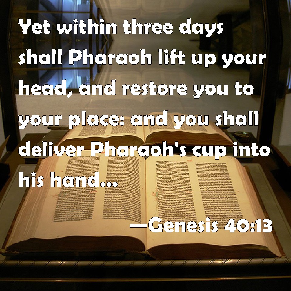 Choose a Background Genesis 40:13 Yet within three days shall Pharaoh lift up your head, and restore you to your place: and you shall deliver Pharaoh's cup into his hand, after the former manner when you were his butler. KJV: Yet within three days shall Pharaoh lift up thine head, and restore thee unto thy place: and thou shalt deliver Pharaoh's cup into his hand, after the former manner when thou wast his butler. DRB: After which Pharao will remember thy service, and will restore thee to thy former place: and thou shah present him the cup according to thy office, as before thou wast wont to do. DBT: In yet three days will Pharaoh lift up thy head and restore thee to thy place, and thou shalt deliver Pharaoh's cup into his hand, after the former manner when thou wast his cup-bearer. ERV: within yet three days shall Pharaoh lift up thine head, and restore thee unto thine office: and thou shalt give Pharaoh's cup into his hand, after the former manner when thou wast his butler. WBT: Yet within three days shall Pharaoh lift up thy head, and restore thee to thy place: and thou shalt deliver Pharaoh's cup into his hand, after the former manner when thou wast his butler. WEB: Within three more days, Pharaoh will lift up your head, and restore you to your office. You will give Pharaoh's cup into his hand, the way you did when you were his cupbearer. YLT: yet, within three days doth Pharaoh lift up thy head, and hath put thee back on thy station, and thou hast given the cup of Pharaoh into his hand, according to the former custom when thou wast his butler.Links Genesis 40:13 NIV • Genesis 40:13 NLT • Genesis 40:13 ESV • Genesis 40:13 NASB • Genesis 40:13 KJV • Genesis 40:13 Interlinear • Genesis 40:13 Commentaries • Genesis 40:13 Parallel Texts • Genesis 40:13 Bible Apps • Genesis 40:13 Parallel • Bible Hub |