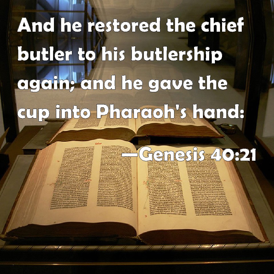 Genesis 40:21 And he restored the chief butler to his butlership again; and he gave the cup into Pharaoh's hand: