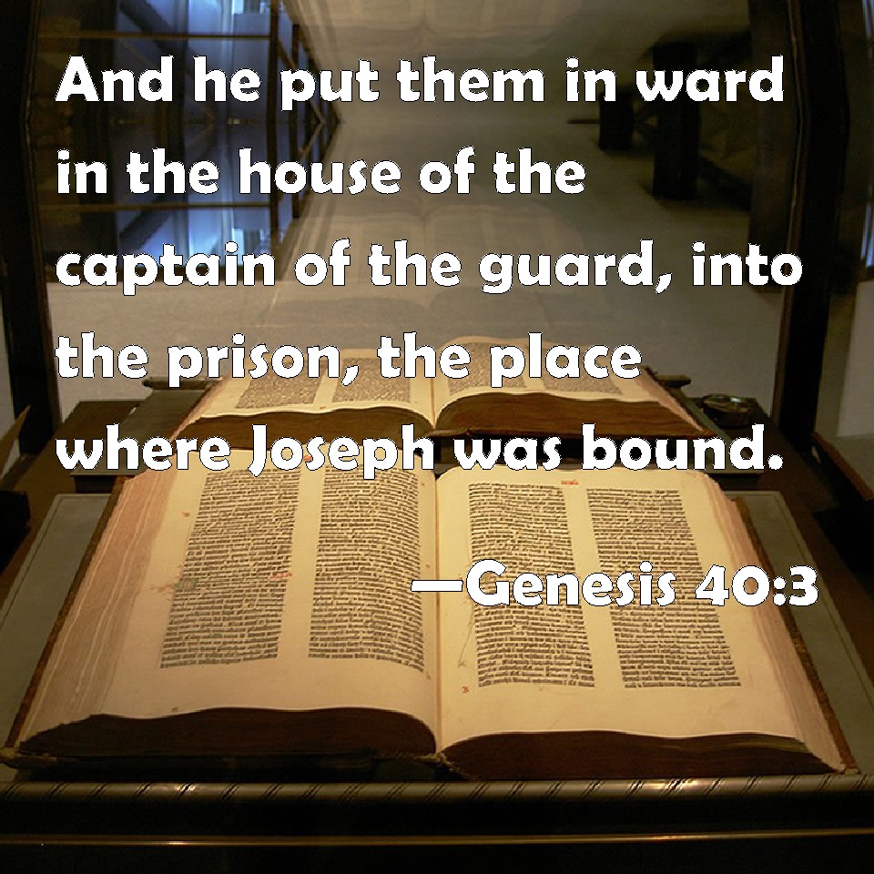 Choose a Background Genesis 40:3 And he put them in ward in the house of the captain of the guard, into the prison, the place where Joseph was bound. KJV: And he put them in ward in the house of the captain of the guard, into the prison, the place where Joseph was bound. DRB: He sent them to the prison of the commander of the soldiers, in which Joseph also was prisoner, DBT: and he put them in custody into the house of the captain of the life-guard, into the tower-house, into the place where Joseph was imprisoned. ERV: And he put them in ward in the house of the captain of the guard, into the prison, the place where Joseph was bound. WBT: And he put them in custody in the house of the captain of the guard, into the prison, the place where Joseph was bound. WEB: He put them in custody in the house of the captain of the guard, into the prison, the place where Joseph was bound. YLT: and giveth them in charge in the house of the chief of the executioners, unto the round-house, the place where Joseph is a prisoner,Links Genesis 40:3 NIV • Genesis 40:3 NLT • Genesis 40:3 ESV • Genesis 40:3 NASB • Genesis 40:3 KJV • Genesis 40:3 Interlinear • Genesis 40:3 Commentaries • Genesis 40:3 Parallel Texts • Genesis 40:3 Bible Apps • Genesis 40:3 Parallel • Bible Hub |