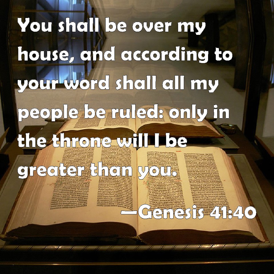 Genesis 41:40 You shall be over my house, and according to your word shall all my people be ruled: only in the throne will I be greater than you.