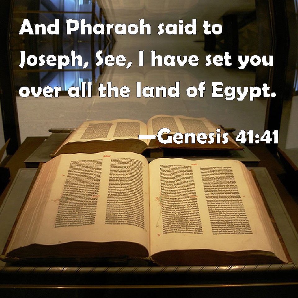 Choose a Background Genesis 41:41 And Pharaoh said to Joseph, See, I have set you over all the land of Egypt. KJV: And Pharaoh said unto Joseph, See, I have set thee over all the land of Egypt. DRB: And again Pharao said to Joseph: Behold, I have appointed thee over the whole land of Egypt. DBT: And Pharaoh said to Joseph, See, I have set thee over all the land of Egypt. ERV: And Pharaoh said unto Joseph, See, I have set thee over all the land of Egypt. WBT: And Pharaoh said to Joseph, See, I have set thee over all the land of Egypt. WEB: Pharaoh said to Joseph, "Behold, I have set you over all the land of Egypt." YLT: And Pharaoh saith unto Joseph, 'See, I have put thee over all the land of Egypt.'Links Genesis 41:41 NIV • Genesis 41:41 NLT • Genesis 41:41 ESV • Genesis 41:41 NASB • Genesis 41:41 KJV • Genesis 41:41 Interlinear • Genesis 41:41 Commentaries • Genesis 41:41 Parallel Texts • Genesis 41:41 Bible Apps • Genesis 41:41 Parallel • Bible Hub |
