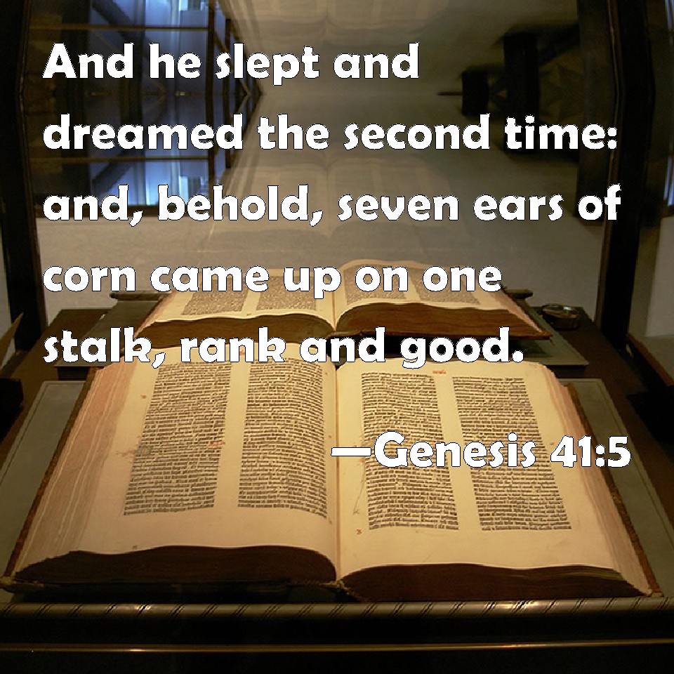 Choose a Background Genesis 41:5 And he slept and dreamed the second time: and, behold, seven ears of corn came up on one stalk, rank and good. KJV: And he slept and dreamed the second time: and, behold, seven ears of corn came up upon one stalk, rank and good. DRB: He slept again, and dreamed another dream: Seven ears of corn came up upon one stalk full and fair: DBT: And he slept and dreamed the second time; and behold, seven ears of corn grew up on one stalk, fat and good. ERV: And he slept and dreamed a second time: and, behold, seven ears of corn came up upon one stalk, rank and good. WBT: And he slept and dreamed the second time: and behold, seven ears of corn came up upon one stalk, rank and good. WEB: He slept and dreamed a second time: and behold, seven heads of grain came up on one stalk, healthy and good. YLT: And he sleepeth, and dreameth a second time, and lo, seven ears are coming up on one stalk, fat and good,Links Genesis 41:5 NIV • Genesis 41:5 NLT • Genesis 41:5 ESV • Genesis 41:5 NASB • Genesis 41:5 KJV • Genesis 41:5 Interlinear • Genesis 41:5 Commentaries • Genesis 41:5 Parallel Texts • Genesis 41:5 Bible Apps • Genesis 41:5 Parallel • Bible Hub |