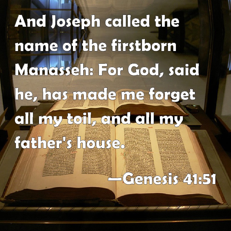 Choose a Background Genesis 41:51 And Joseph called the name of the firstborn Manasseh: For God, said he, has made me forget all my toil, and all my father's house. KJV: And Joseph called the name of the firstborn Manasseh: For God, said he, hath made me forget all my toil, and all my father's house. DRB: And he called the name of the first born Manasses, saying: God hath made me to forget all my labours, and my father's house. DBT: And Joseph called the name of the firstborn Manasseh For God has made me forget all my toil, and all my father's house. ERV: And Joseph called the name of the firstborn Manasseh: For, said he, God hath made me forget all my toil, and all my father's house. WBT: And Joseph called the name of the first-born Manasseh: For God, said he, hath made me forget all my toil, and all my father's house. WEB: Joseph called the name of the firstborn Manasseh, "For," he said, "God has made me forget all my toil, and all my father's house." YLT: and Joseph calleth the name of the first-born Manasseh: 'for, God hath made me to forget all my labour, and all the house of my father;'Links Genesis 41:51 NIV • Genesis 41:51 NLT • Genesis 41:51 ESV • Genesis 41:51 NASB • Genesis 41:51 KJV • Genesis 41:51 Interlinear • Genesis 41:51 Commentaries • Genesis 41:51 Parallel Texts • Genesis 41:51 Bible Apps • Genesis 41:51 Parallel • Bible Hub |