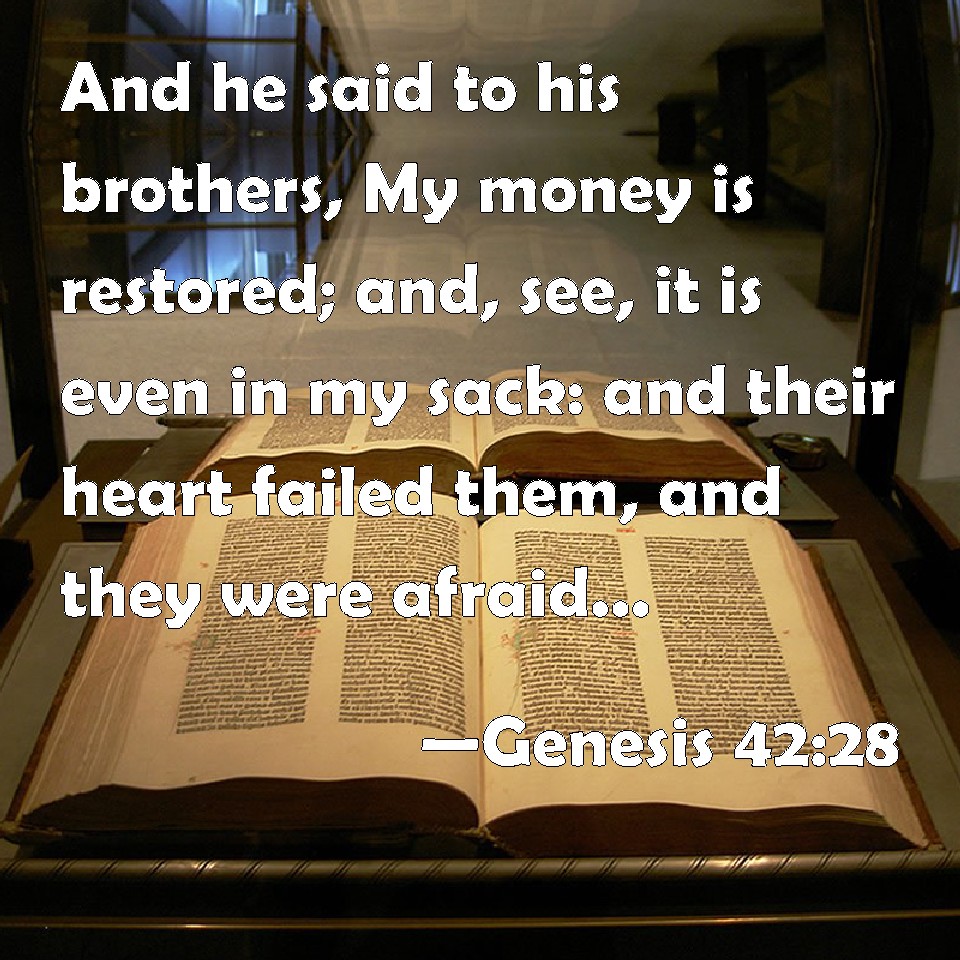 Choose a Background Genesis 42:28 And he said to his brothers, My money is restored; and, see, it is even in my sack: and their heart failed them, and they were afraid, saying one to another, What is this that God has done to us? KJV: And he said unto his brethren, My money is restored; and, lo, it is even in my sack: and their heart failed them, and they were afraid, saying one to another, What is this that God hath done unto us? DRB: And said to his brethren: My money is given me again, hehold it is in the sack. And thye were astonished, and troubled, and said to one another: What is this that God hath done unto us? DBT: And he said to his brethren, My money is returned to me, and behold, it is even in my sack. And their heart failed them, and they were afraid, saying one to another, What is this that God has done to us? ERV: And he said unto his brethren, My money is restored; and, lo, it is even in my sack: and their heart failed them, and they turned trembling one to another, saying, What is this that God hath done unto us? WBT: And he said to his brethren, My money is restored; and see it is even in my sack: and their heart failed them, and they were afraid, saying one to another, What is this that God hath done to us? WEB: He said to his brothers, "My money is restored! Behold, it is in my sack!" Their hearts failed them, and they turned trembling one to another, saying, "What is this that God has done to us?" YLT: and he saith unto his brethren, 'My money hath been put back, and also, lo, in my bag:' and their heart goeth out, and they tremble, one to another saying, 'What is this God hath done to us!'Links Genesis 42:28 NIV • Genesis 42:28 NLT • Genesis 42:28 ESV • Genesis 42:28 NASB • Genesis 42:28 KJV • Genesis 42:28 Interlinear • Genesis 42:28 Commentaries • Genesis 42:28 Parallel Texts • Genesis 42:28 Bible Apps • Genesis 42:28 Parallel • Bible Hub |