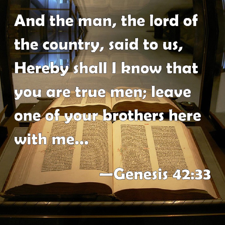 Choose a Background Genesis 42:33 And the man, the lord of the country, said to us, Hereby shall I know that you are true men; leave one of your brothers here with me, and take food for the famine of your households, and be gone: KJV: And the man, the lord of the country, said unto us, Hereby shall I know that ye are true men; leave one of your brethren here with me, and take food for the famine of your households, and be gone: DRB: And he said to us: Hereby shall I know that you are peaceable men: Leave one of your brethren with me, and take ye necessary provision for your houses, and go your ways. DBT: And the man, the lord of the land, said to us, Hereby shall I know that ye are honest: leave one of your brethren with me, and take for the hunger of your households, and go, ERV: And the man, the lord of the land, said unto us, Hereby shall I know that ye are true men; leave one of your brethren with me, and take corn for the famine of your houses, and go your way: WBT: And the man, the lord of the country, said to us, By this shall I know that ye are true men: leave one of your brethren here with me, and take food for the famine of your households, and depart: WEB: The man, the lord of the land, said to us, 'By this I will know that you are honest men: leave one of your brothers with me, and take grain for the famine of your houses, and go your way. YLT: And the man, the lord of the land, saith unto us, By this I know that ye are right men — one of your brethren leave with me, and for the famine of your houses take ye and go,Links Genesis 42:33 NIV • Genesis 42:33 NLT • Genesis 42:33 ESV • Genesis 42:33 NASB • Genesis 42:33 KJV • Genesis 42:33 Interlinear • Genesis 42:33 Commentaries • Genesis 42:33 Parallel Texts • Genesis 42:33 Bible Apps • Genesis 42:33 Parallel • Bible Hub |