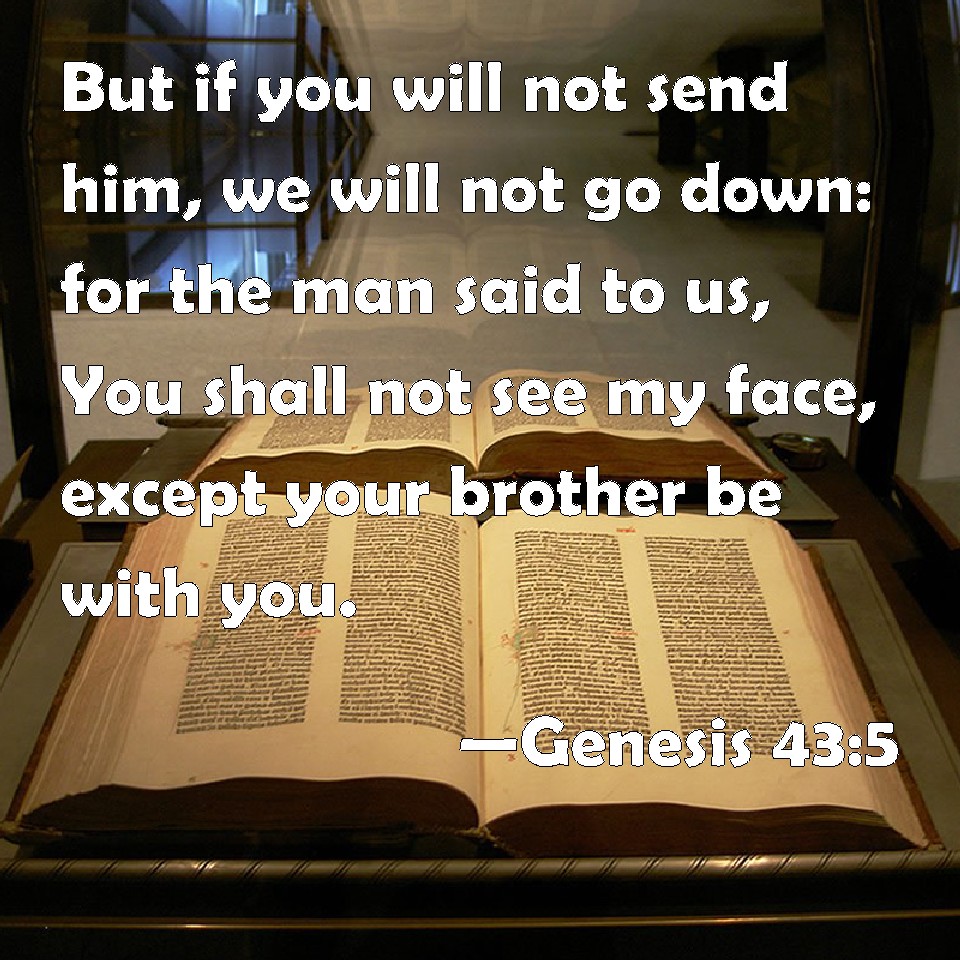 Choose a Background Genesis 43:5 But if you will not send him, we will not go down: for the man said to us, You shall not see my face, except your brother be with you. KJV: But if thou wilt not send him, we will not go down: for the man said unto us, Ye shall not see my face, except your brother be with you. DRB: But if thou wilt not, we will not go: for the man, as we have often said, declared unto us, saying: You shall not see my face without your youngest brother. DBT: but if thou do not send him, we will not go down, for the man said to us, Ye shall not see my face, unless your brother be with you. ERV: but if thou wilt not send him, we will not go down: for the man said unto us, Ye shall not see my face, except your brother be with you. WBT: But if thou wilt not send him, we will not go down, for the man said to us, Ye shall not see my face, except your brother be with you. WEB: but if you'll not send him, we'll not go down, for the man said to us, 'You shall not see my face, unless your brother is with you.'" YLT: and if thou art not sending — we do not go down, for the man said unto us, Ye do not see my face without your brother being with you.'Links Genesis 43:5 NIV • Genesis 43:5 NLT • Genesis 43:5 ESV • Genesis 43:5 NASB • Genesis 43:5 KJV • Genesis 43:5 Interlinear • Genesis 43:5 Commentaries • Genesis 43:5 Parallel Texts • Genesis 43:5 Bible Apps • Genesis 43:5 Parallel • Bible Hub |
