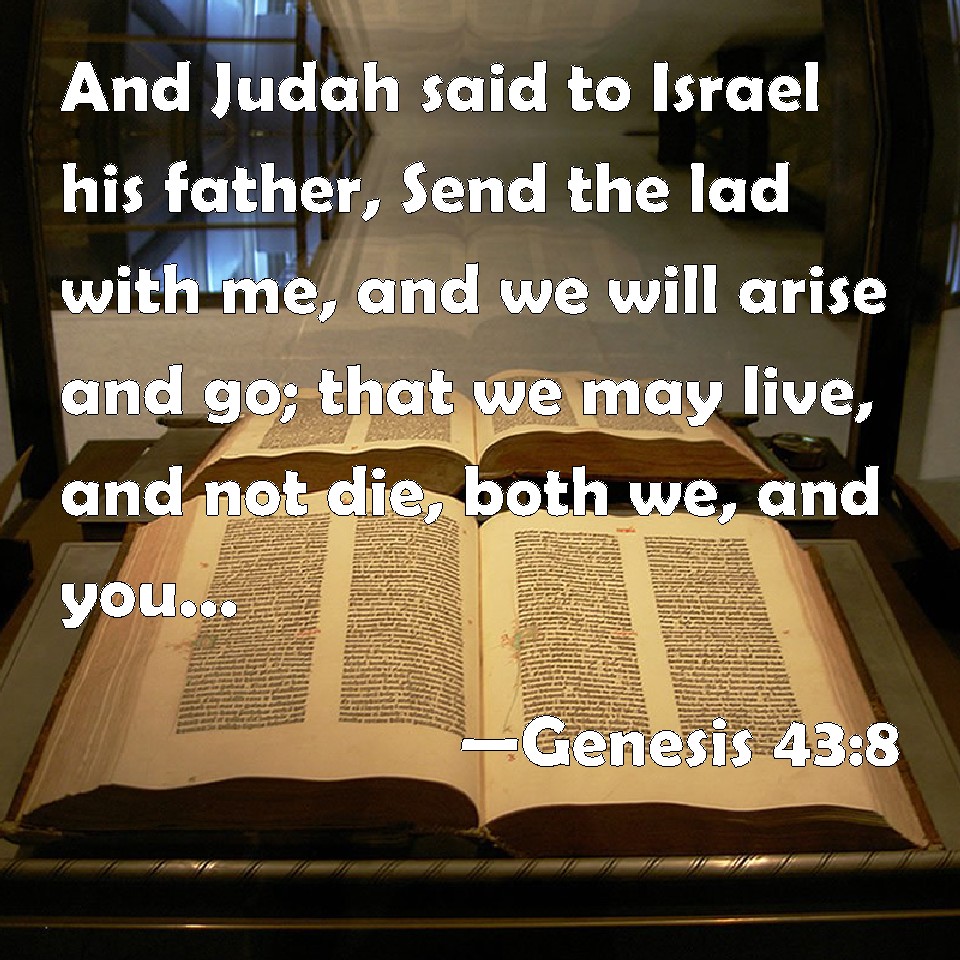Choose a Background Genesis 43:8 And Judah said to Israel his father, Send the lad with me, and we will arise and go; that we may live, and not die, both we, and you, and also our little ones. KJV: And Judah said unto Israel his father, Send the lad with me, and we will arise and go; that we may live, and not die, both we, and thou, and also our little ones. DRB: And Juda said to his father: Send the bou with me, that we may set forward, and may live: lest both we and our children perish. DBT: And Judah said to Israel his father, Send the lad with me, and we will arise and go, that we may live, and not die, both we and thou and our little ones. ERV: And Judah said unto Israel his father, Send the lad with me, and we will arise and go; that we may live, and not die, both we, and thou, and also our little ones. WBT: And Judah said to Israel, his father, Send the lad with me, and we will arise and go; that we may live, and not die, both we, and thou, and also our little ones. WEB: Judah said to Israel, his father, "Send the boy with me, and we'll get up and go, so that we may live, and not die, both we, and you, and also our little ones. YLT: And Judah saith unto Israel his father, 'Send the youth with me, and we arise, and go, and live, and do not die, both we, and thou, and our infants.Links Genesis 43:8 NIV • Genesis 43:8 NLT • Genesis 43:8 ESV • Genesis 43:8 NASB • Genesis 43:8 KJV • Genesis 43:8 Interlinear • Genesis 43:8 Commentaries • Genesis 43:8 Parallel Texts • Genesis 43:8 Bible Apps • Genesis 43:8 Parallel • Bible Hub |