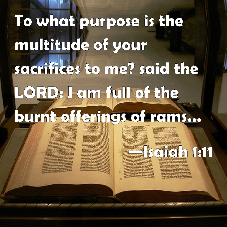 Choose a Background Isaiah 1:11 To what purpose is the multitude of your sacrifices to me? said the LORD: I am full of the burnt offerings of rams, and the fat of fed beasts; and I delight not in the blood of bullocks, or of lambs, or of he goats. KJV: To what purpose is the multitude of your sacrifices unto me? saith the LORD: I am full of the burnt offerings of rams, and the fat of fed beasts; and I delight not in the blood of bullocks, or of lambs, or of he goats. DRB: To what purpose do you offer me the multitude of your victims, saith the Lord? I am full, I desire not holocausts of rams, and fat of fatlings, and blood of calves, and lambs, and buck goats. DBT: To what purpose is the multitude of your sacrifices unto me? saith Jehovah. I am sated with burnt-offerings of rams, and the fat of fed beasts; and in the blood of bullocks, and of lambs, and of he-goats I take no pleasure. ERV: To what purpose is the multitude of your sacrifices unto me? saith the LORD: I am full of the burnt offerings of rams, and the fat of fed beasts; and I delight not in the blood of bullocks, or of lambs, or of he-goats. WBT: To what purpose is the multitude of your sacrifices to me? saith the LORD: I am full of the burnt-offerings of rams, and the fat of fed beasts; and I delight not in the blood of bullocks, or of lambs, or of he-goats. WEB: "What are the multitude of your sacrifices to me?," says Yahweh. "I have had enough of the burnt offerings of rams, and the fat of fed animals. I don't delight in the blood of bulls, or of lambs, or of male goats. YLT: Why to Me the abundance of your sacrifices? saith Jehovah, I have been satiated with burnt-offerings of rams, And fat of fatlings; And blood of bullocks, and lambs, And he-goats I have not desired.Links Isaiah 1:11 NIV • Isaiah 1:11 NLT • Isaiah 1:11 ESV • Isaiah 1:11 NASB • Isaiah 1:11 KJV • Isaiah 1:11 Interlinear • Isaiah 1:11 Commentaries • Isaiah 1:11 Parallel Texts • Isaiah 1:11 Bible Apps • Isaiah 1:11 Parallel • Bible Hub |