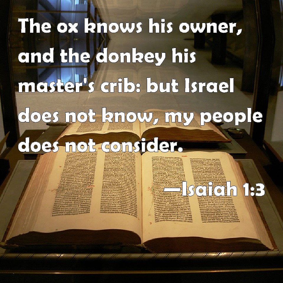 Choose a Background Isaiah 1:3 The ox knows his owner, and the ass his master's crib: but Israel does not know, my people does not consider. KJV: The ox knoweth his owner, and the ass his master's crib: but Israel doth not know, my people doth not consider. DRB: The ox knoweth his owner, and the ass his master's crib: but Israel hath not known me, and my people hath not understood. DBT: The ox knoweth his owner, and the ass his master's crib; Israel doth not know, my people hath no intelligence. ERV: The ox knoweth his owner, and the ass his master's crib: but Israel doth not know, my people doth not consider. WBT: The ox knoweth his owner, and the ass his master's crib: but Israel doth not know, my people doth not consider. WEB: The ox knows his owner, and the donkey his master's crib; but Israel doesn't know, my people don't consider." YLT: An ox hath known its owner, And an ass the crib of its master, Israel hath not known, My people hath not understood.Links Isaiah 1:3 NIV • Isaiah 1:3 NLT • Isaiah 1:3 ESV • Isaiah 1:3 NASB • Isaiah 1:3 KJV • Isaiah 1:3 Interlinear • Isaiah 1:3 Commentaries • Isaiah 1:3 Parallel Texts • Isaiah 1:3 Bible Apps • Isaiah 1:3 Parallel • Bible Hub |