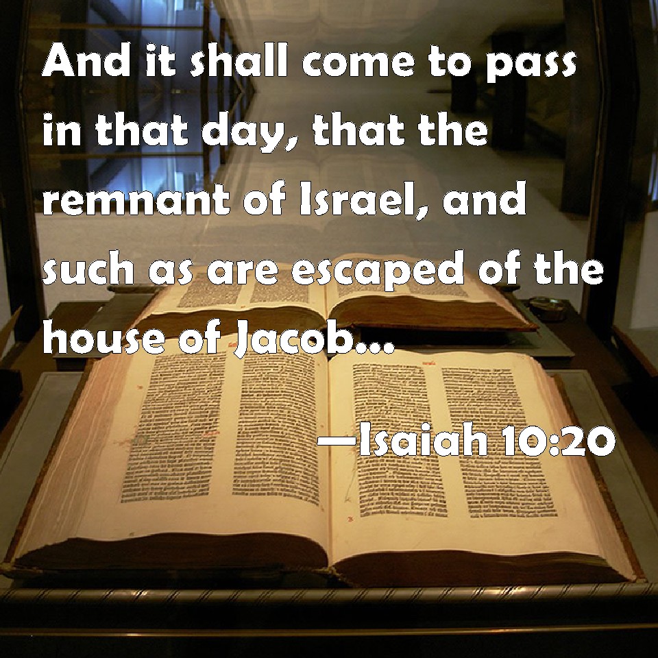 Choose a Background Isaiah 10:20 And it shall come to pass in that day, that the remnant of Israel, and such as are escaped of the house of Jacob, shall no more again stay on him that smote them; but shall stay on the LORD, the Holy One of Israel, in truth. KJV: And it shall come to pass in that day, that the remnant of Israel, and such as are escaped of the house of Jacob, shall no more again stay upon him that smote them; but shall stay upon the LORD, the Holy One of Israel, in truth. DRB: And it shall come to pass in that day, that the remnant of Israel, and they that shall escape of the house of Jacob, shall lean no more upon him that striketh them: but they shall lean upon the Lord the Holy One of Israel, in truth. DBT: And it shall come to pass in that day, that the remnant of Israel and such as are escaped of the house of Jacob shall no more again rely upon him that smote them; but they shall rely upon Jehovah, the Holy One of Israel, in truth. ERV: And it shall come to pass in that day, that the remnant of Israel, and they that are escaped of the house of Jacob, shall no more again stay upon him that smote them; but shall stay upon the LORD, the Holy One of Israel, in truth. WBT: And it shall come to pass in that day, that the remnant of Israel, and such as have escaped of the house of Jacob, shall no more again lean upon him that smote them; but shall lean upon the LORD, the Holy One of Israel, in truth. WEB: It will come to pass in that day that the remnant of Israel, and those who have escaped from the house of Jacob will no more again lean on him who struck them, but shall lean on Yahweh, the Holy One of Israel, in truth. YLT: And it hath come to pass, in that day, The remnant of Israel, And the escaped of the house of Jacob, Do not add any more to lean on its smiter, And have leant on Jehovah, The Holy One of Israel, in truth.Links Isaiah 10:20 NIV • Isaiah 10:20 NLT • Isaiah 10:20 ESV • Isaiah 10:20 NASB • Isaiah 10:20 KJV • Isaiah 10:20 Interlinear • Isaiah 10:20 Commentaries • Isaiah 10:20 Parallel Texts • Isaiah 10:20 Bible Apps • Isaiah 10:20 Parallel • Bible Hub |