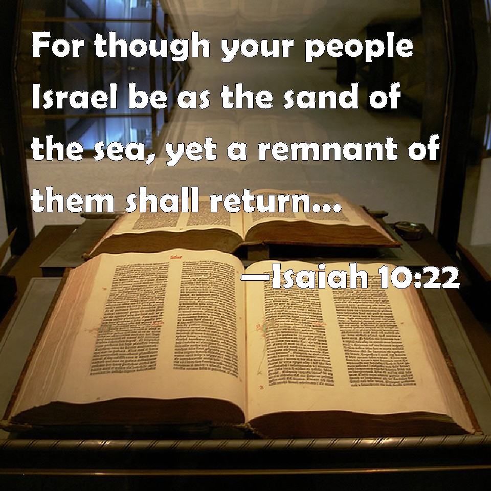 Choose a Background Isaiah 10:22 For though your people Israel be as the sand of the sea, yet a remnant of them shall return: the consumption decreed shall overflow with righteousness. KJV: For though thy people Israel be as the sand of the sea, yet a remnant of them shall return: the consumption decreed shall overflow with righteousness. DRB: For if thy people, O Israel, shall be as the sand of the sea, a remnant of them shall be converted, the consumption abridged shall overflow with justice. DBT: For though thy people Israel be as the sand of the sea, only a remnant of them shall return: the consumption determined shall overflow in righteousness. ERV: For though thy people Israel be as the sand of the sea, only a remnant of them shall return: a consumption is determined, overflowing with righteousness. WBT: For though thy people Israel be as the sand of the sea, yet a remnant of them shall return: the consumption decreed shall overflow with righteousness. WEB: For though your people, Israel, are like the sand of the sea, only a remnant of them will return. A destruction is determined, overflowing with righteousness. YLT: For though thy people Israel be as the sand of the sea, A remnant doth return of it, A consumption determined, Overflowing with righteousness.Links Isaiah 10:22 NIV • Isaiah 10:22 NLT • Isaiah 10:22 ESV • Isaiah 10:22 NASB • Isaiah 10:22 KJV • Isaiah 10:22 Interlinear • Isaiah 10:22 Commentaries • Isaiah 10:22 Parallel Texts • Isaiah 10:22 Bible Apps • Isaiah 10:22 Parallel • Bible Hub |
