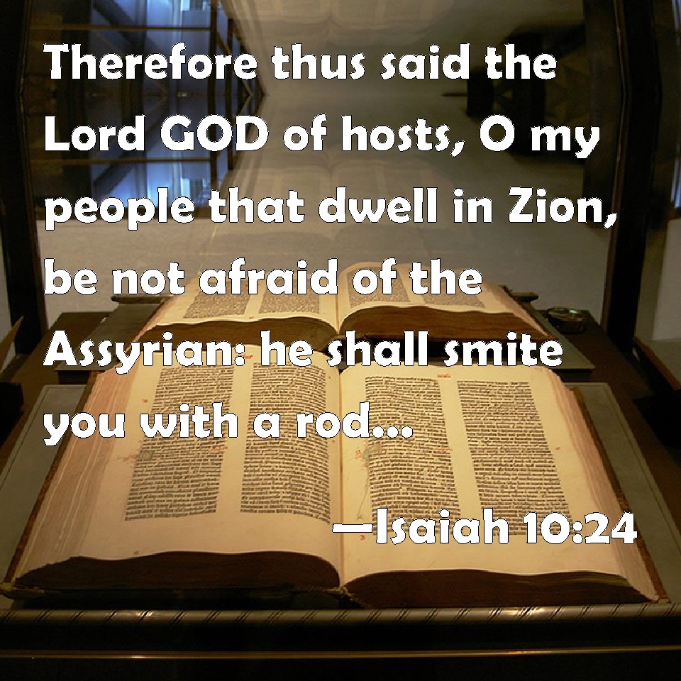Choose a Background Isaiah 10:24 Therefore thus said the Lord GOD of hosts, O my people that dwell in Zion, be not afraid of the Assyrian: he shall smite you with a rod, and shall lift up his staff against you, after the manner of Egypt. KJV: Therefore thus saith the Lord GOD of hosts, O my people that dwellest in Zion, be not afraid of the Assyrian: he shall smite thee with a rod, and shall lift up his staff against thee, after the manner of Egypt. DRB: Therefore, thus saith the Lord the God of hosts: O my people that dwellest in Sion, be not afraid of the Assyrian: he shall strike thee with his rod, and he shall lift up his staff over thee in the way of Egypt. DBT: Therefore thus saith the Lord, Jehovah of hosts: O my people that dwellest in Zion, be not afraid of the Assyrian; he shall smite thee with a rod, and shall lift up his staff against thee, after the manner of Egypt: ERV: Therefore thus saith the Lord, the LORD of hosts, O my people that dwellest in Zion, be not afraid of the Assyrian: though he smite thee with the rod, and lift up his staff against thee, after the manner of Egypt. WBT: Therefore thus saith the Lord GOD of hosts, O my people that dwellest in Zion, be not afraid of the Assyrian: he shall smite thee with a rod, and shall lift up his staff against thee, after the manner of Egypt. WEB: Therefore the Lord, Yahweh of Armies, says "My people who dwell in Zion, don't be afraid of the Assyrian, though he strike you with the rod, and lift up his staff against you, as Egypt did. YLT: Therefore, thus said the Lord, Jehovah of Hosts, 'Be not afraid, my people, inhabiting Zion, because of Asshur, With a rod he doth smite thee, And his staff lifteth up against thee, in the way of Egypt.Links Isaiah 10:24 NIV • Isaiah 10:24 NLT • Isaiah 10:24 ESV • Isaiah 10:24 NASB • Isaiah 10:24 KJV • Isaiah 10:24 Interlinear • Isaiah 10:24 Commentaries • Isaiah 10:24 Parallel Texts • Isaiah 10:24 Bible Apps • Isaiah 10:24 Parallel • Bible Hub |