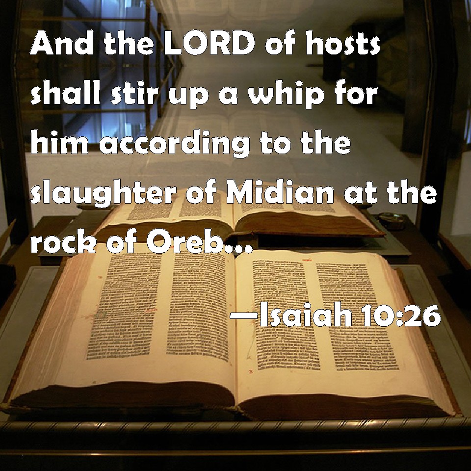 Choose a Background Isaiah 10:26 And the LORD of hosts shall stir up a whip for him according to the slaughter of Midian at the rock of Oreb: and as his rod was on the sea, so shall he lift it up after the manner of Egypt. KJV: And the LORD of hosts shall stir up a scourge for him according to the slaughter of Midian at the rock of Oreb: and as his rod was upon the sea, so shall he lift it up after the manner of Egypt. DRB: And the Lord of hosts shall raise up a scourge against him, according to the slaughter of Madian in the rock of Oreb, and his rod over the sea, and he shall lift it up in the way of Egypt. DBT: And Jehovah of hosts will stir up a scourge against him, according to the slaughter of Midian at the rock of Oreb; and his rod shall be upon the sea, and he will lift it up after the manner of Egypt. ERV: And the LORD of hosts shall stir up against him a scourge, as in the slaughter of Midian at the rock of Oreb: and his rod shall be over the sea, and he shall lift it up after the manner of Egypt. WBT: And the LORD of hosts will raise up a scourge for him according to the slaughter of Midian at the rock of Oreb: and as his rod was upon the sea, so shall he lift it up after the manner of Egypt. WEB: Yahweh of Armies will stir up a scourge against him, as in the slaughter of Midian at the rock of Oreb. His rod will be over the sea, and he will lift it up like he did against Egypt. YLT: And awaking for him is Jehovah of Hosts, A scourge like the smiting of Midian at the rock Oreb, And his rod is over the sea, And he hath lifted it in the way of Egypt.Links Isaiah 10:26 NIV • Isaiah 10:26 NLT • Isaiah 10:26 ESV • Isaiah 10:26 NASB • Isaiah 10:26 KJV • Isaiah 10:26 Interlinear • Isaiah 10:26 Commentaries • Isaiah 10:26 Parallel Texts • Isaiah 10:26 Bible Apps • Isaiah 10:26 Parallel • Bible Hub |