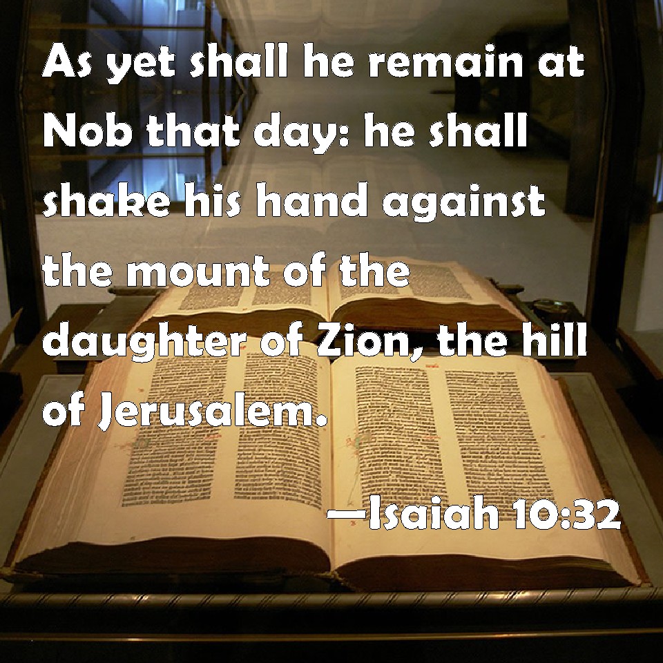 Choose a Background Isaiah 10:32 As yet shall he remain at Nob that day: he shall shake his hand against the mount of the daughter of Zion, the hill of Jerusalem. KJV: As yet shall he remain at Nob that day: he shall shake his hand against the mount of the daughter of Zion, the hill of Jerusalem. DRB: It is yet day enough, to remain in Nobe: he shall shake his hand against the mountain of the daughter of Sion, the hill of Jerusalem. DBT: Still a day of halting at Nob; he shaketh his hand against the mount of the daughter of Zion, the hill of Jerusalem. ... ERV: This very day shall he halt at Nob: he shaketh his hand at the mount of the daughter of Zion, the hill of Jerusalem. WBT: As yet shall he remain at Nob that day: he shall shake his hand against the mount of the daughter of Zion, the hill of Jerusalem. WEB: This very day he will halt at Nob. He shakes his hand at the mountain of the daughter of Zion, the hill of Jerusalem. YLT: Yet to-day in Nob to remain, Wave its hand doth the mount of the daughter of Zion, The hill of Jerusalem.Links Isaiah 10:32 NIV • Isaiah 10:32 NLT • Isaiah 10:32 ESV • Isaiah 10:32 NASB • Isaiah 10:32 KJV • Isaiah 10:32 Interlinear • Isaiah 10:32 Commentaries • Isaiah 10:32 Parallel Texts • Isaiah 10:32 Bible Apps • Isaiah 10:32 Parallel • Bible Hub |