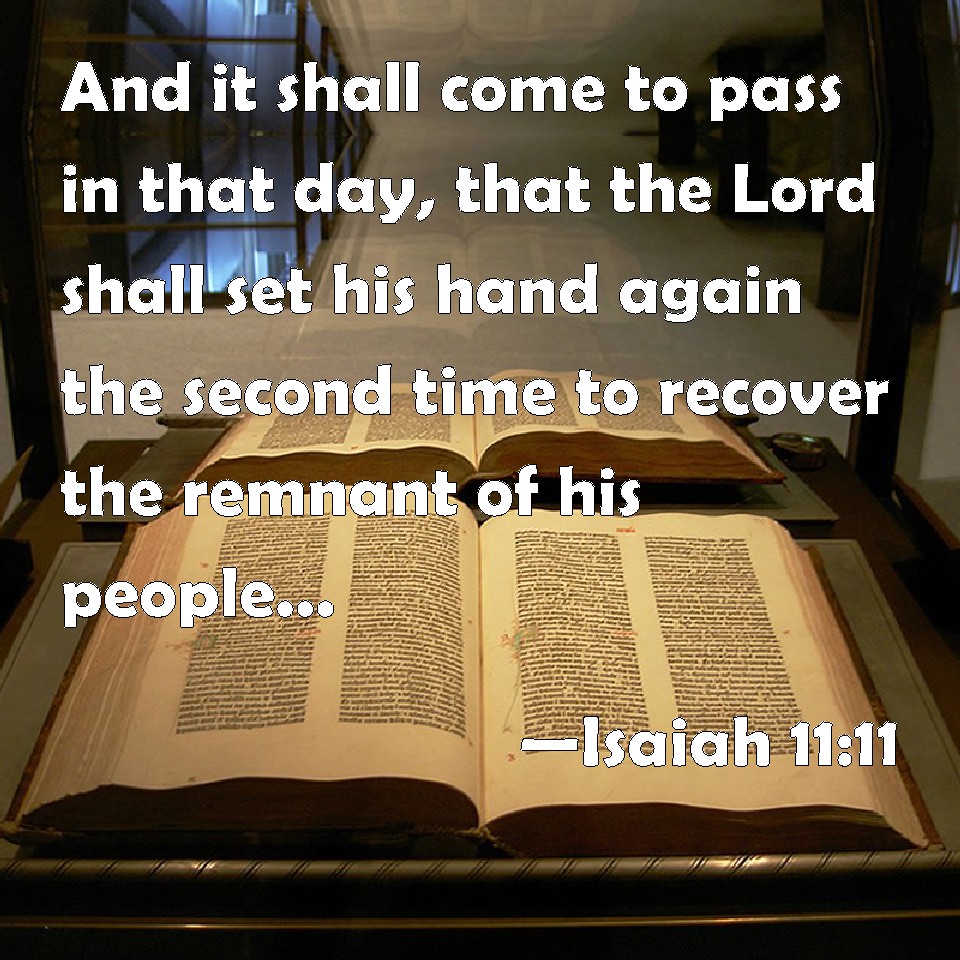 Choose a Background Isaiah 11:11 And it shall come to pass in that day, that the Lord shall set his hand again the second time to recover the remnant of his people, which shall be left, from Assyria, and from Egypt, and from Pathros, and from Cush, and from Elam, and from Shinar, and from Hamath, and from the islands of the sea. KJV: And it shall come to pass in that day, that the Lord shall set his hand again the second time to recover the remnant of his people, which shall be left, from Assyria, and from Egypt, and from Pathros, and from Cush, and from Elam, and from Shinar, and from Hamath, and from the islands of the sea. DRB: And it shall come to pass in that day, that the Lord shall set his hand the second time to possess the remnant of his people, which shall be left from the Assyrians, and from Egypt, and from Phetros, and from Ethiopia, and from Elam, and from Sennaar, and from Emath, and from the islands of the sea. DBT: And it shall come to pass in that day, that the Lord shall set his hand again the second time to acquire the remnant of his people which shall be left, from Assyria, and from Egypt, and from Pathros, and from Cush, and from Elam, and from Shinar, and from Hamath, and from the islands of the sea. ERV: And it shall come to pass in that day, that the Lord shall set his hand again the second time to recover the remnant of his people, which shall remain, from Assyria, and from Egypt, and from Pathros, and from Cush, and from Elam, and from Shinar, and from Hamath, and from the islands of the sea. WBT: And it shall come to pass in that day, that the Lord will set his hand again the second time to recover the remnant of his people, which shall be left, from Assyria, and from Egypt, and from Pathros, and from Cush, and from Elam, and from Shinar, and from Hamath, and from the isles of the sea. WEB: It will happen in that day that the Lord will set his hand again the second time to recover the remnant that is left of his people from Assyria, from Egypt, from Pathros, from Cush, from Elam, from Shinar, from Hamath, and from the islands of the sea. YLT: And it hath come to pass, in that day, The Lord addeth a second time his power, To get the remnant of His people that is left, From Asshur, and from Egypt, And from Pathros, and from Cush, And from Elam, and from Shinar, And from Hamath, and from isles of the sea,Links Isaiah 11:11 NIV • Isaiah 11:11 NLT • Isaiah 11:11 ESV • Isaiah 11:11 NASB • Isaiah 11:11 KJV • Isaiah 11:11 Interlinear • Isaiah 11:11 Commentaries • Isaiah 11:11 Parallel Texts • Isaiah 11:11 Bible Apps • Isaiah 11:11 Parallel • Bible Hub |