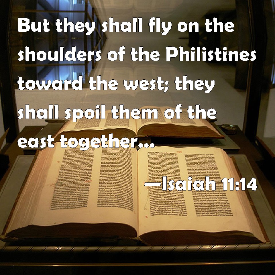 Isaiah 11:14 But they shall fly on the shoulders of the Philistines toward the west; they shall spoil them of the east together: they shall lay their hand on Edom and Moab; and the children of Ammon shall obey them.