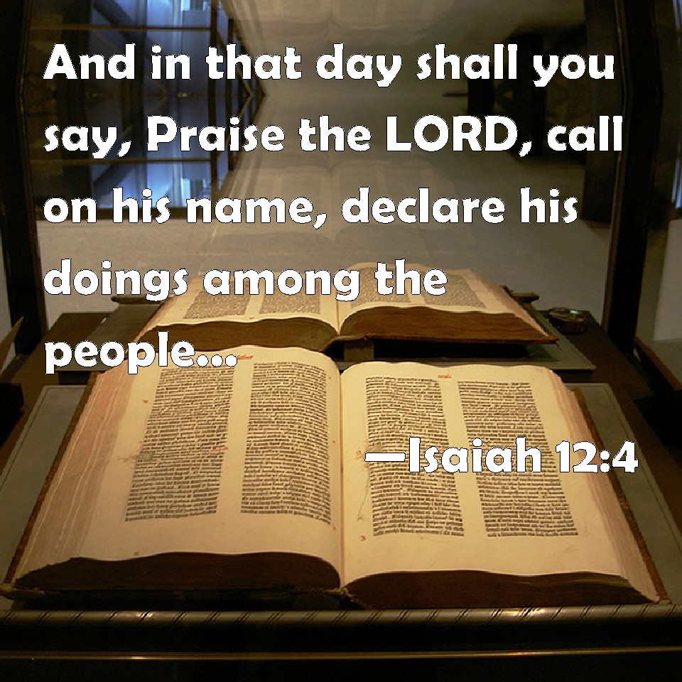 Choose a Background Isaiah 12:4 And in that day shall you say, Praise the LORD, call on his name, declare his doings among the people, make mention that his name is exalted. KJV: And in that day shall ye say, Praise the LORD, call upon his name, declare his doings among the people, make mention that his name is exalted. DRB: And you shall say in that day: Praise ye the Lord, and call upon his name: make his works known among the people: remember that his name is high. DBT: And in that day shall ye say, Give ye thanks to Jehovah, call upon his name, declare his deeds among the peoples, make mention that his name is exalted. ERV: And in that day shall ye say, Give thanks unto the LORD, call upon his name, declare his doings among the peoples, make mention that his name is exalted. WBT: And in that day shall ye say, Praise the LORD, call upon his name, declare his doings among the people, make mention that his name is exalted. WEB: In that day you will say, "Give thanks to Yahweh! Call on his name. Declare his doings among the peoples. Proclaim that his name is exalted! YLT: And ye have said in that day, Give ye praise to Jehovah, call in His name. Make known among the peoples His acts. Make mention that set on high is His name.Links Isaiah 12:4 NIV • Isaiah 12:4 NLT • Isaiah 12:4 ESV • Isaiah 12:4 NASB • Isaiah 12:4 KJV • Isaiah 12:4 Interlinear • Isaiah 12:4 Commentaries • Isaiah 12:4 Parallel Texts • Isaiah 12:4 Bible Apps • Isaiah 12:4 Parallel • Bible Hub |