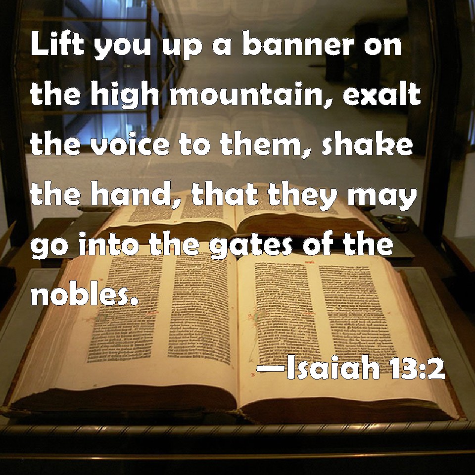 Choose a Background Isaiah 13:2 Lift you up a banner on the high mountain, exalt the voice to them, shake the hand, that they may go into the gates of the nobles. KJV: Lift ye up a banner upon the high mountain, exalt the voice unto them, shake the hand, that they may go into the gates of the nobles. DRB: Upon the dark mountain lift ye up a banner, exalt the voice, lift up the hand, and let the rulers go into the gates. DBT: Lift up a banner upon a bare mountain, raise the voice unto them, shake the hand, that they may enter the gates of the nobles. ERV: Set ye up an ensign upon the bare mountain, lift up the voice unto them, wave the hand, that they may go into the gates of the nobles. WBT: Lift ye up a banner upon the high mountain, exalt the voice to them, shake the hand, that they may go into the gates of the nobles. WEB: Set up a banner on the bare mountain! Lift up your voice to them! Wave your hand, that they may go into the gates of the nobles. YLT: 'On a high mountain lift ye up an ensign, Raise the voice to them, wave the hand, And they go in to the openings of nobles.Links Isaiah 13:2 NIV • Isaiah 13:2 NLT • Isaiah 13:2 ESV • Isaiah 13:2 NASB • Isaiah 13:2 KJV • Isaiah 13:2 Interlinear • Isaiah 13:2 Commentaries • Isaiah 13:2 Parallel Texts • Isaiah 13:2 Bible Apps • Isaiah 13:2 Parallel • Bible Hub |