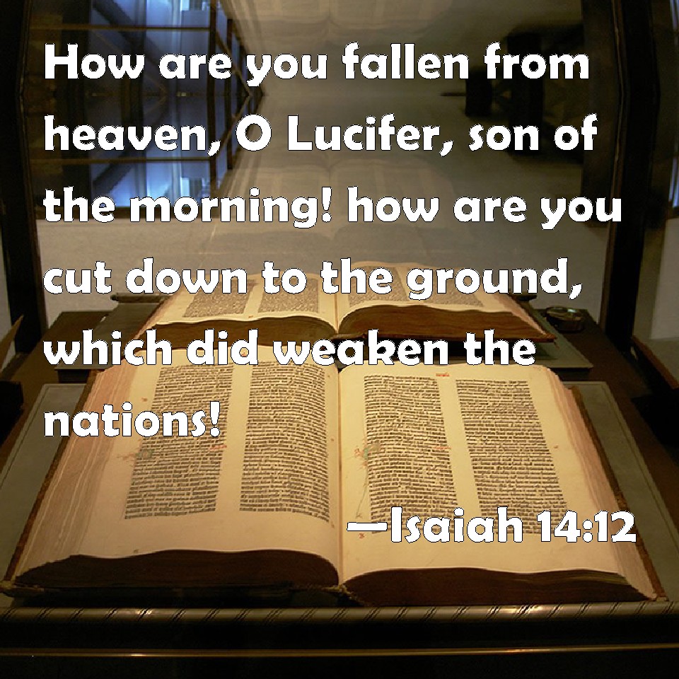 Choose a Background Isaiah 14:12 How are you fallen from heaven, O Lucifer, son of the morning! how are you cut down to the ground, which did weaken the nations! KJV: How art thou fallen from heaven, O Lucifer, son of the morning! how art thou cut down to the ground, which didst weaken the nations! DRB: How art thou fallen from heaven, O Lucifer, who didst rise in the morning? how art thou fallen to the earth, that didst wound the nations? DBT: How art thou fallen from heaven, Lucifer, son of the morning! Thou art cut down to the ground, that didst prostrate the nations! ERV: How art thou fallen from heaven, O day star, son of the morning! how art thou cut down to the ground, which didst lay low the nations! WBT: How art thou fallen from heaven, O Lucifer, son of the morning! how art thou cut down to the ground, which didst weaken the nations! WEB: How you have fallen from heaven, morning star, son of the dawn! How you are cut down to the ground, who laid the nations low! YLT: How hast thou fallen from the heavens, O shining one, son of the dawn! Thou hast been cut down to earth, O weakener of nations.Links Isaiah 14:12 NIV • Isaiah 14:12 NLT • Isaiah 14:12 ESV • Isaiah 14:12 NASB • Isaiah 14:12 KJV • Isaiah 14:12 Interlinear • Isaiah 14:12 Commentaries • Isaiah 14:12 Parallel Texts • Isaiah 14:12 Bible Apps • Isaiah 14:12 Parallel • Bible Hub |